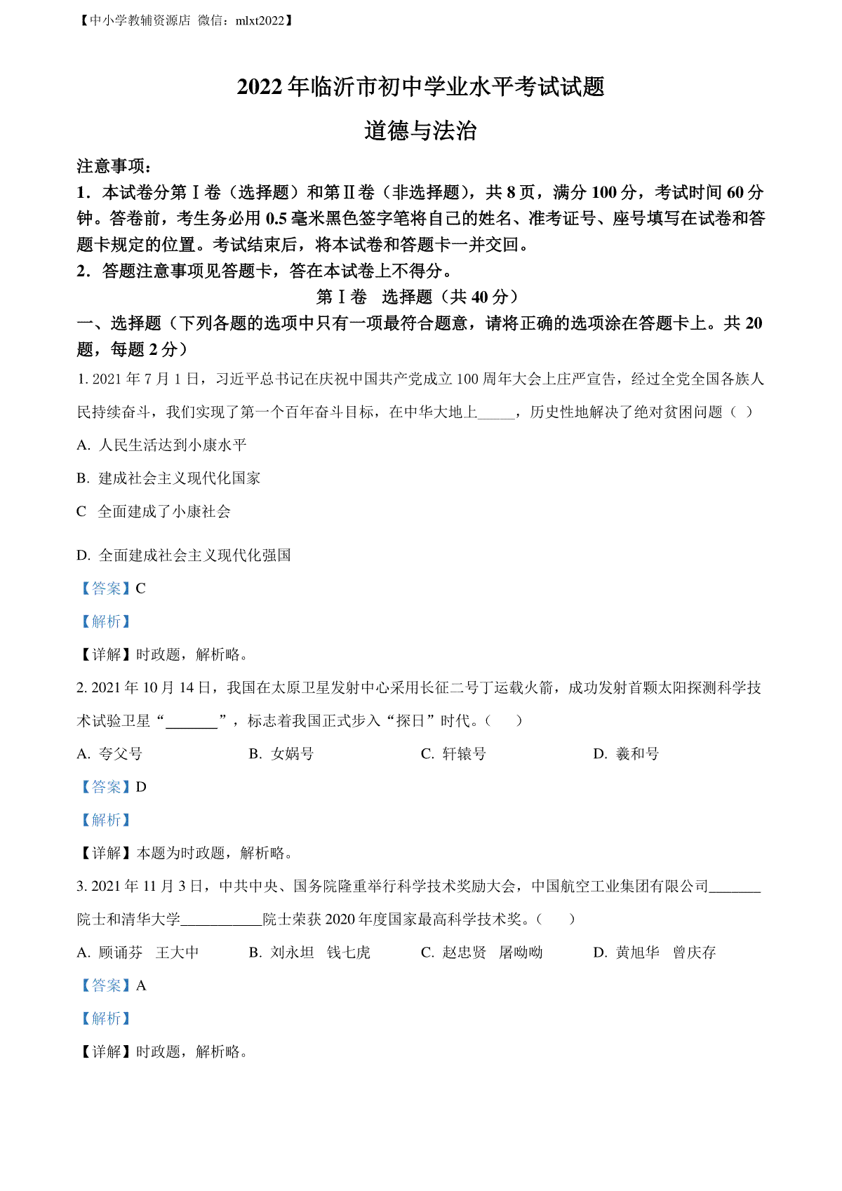 1.精品解析:2022年山东省临沂市中考道德与法治真题(解析版)
