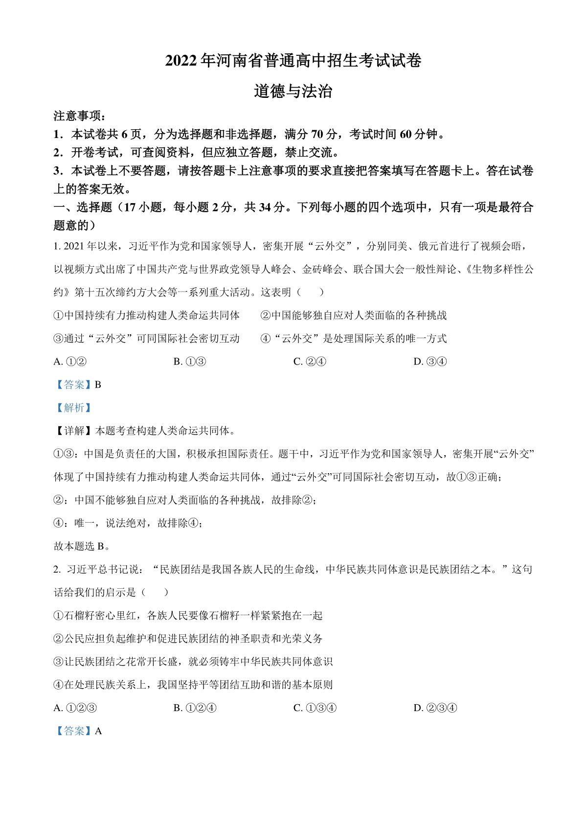 一、精品解析:2022年河南省中考道德与法治真题(解析版)