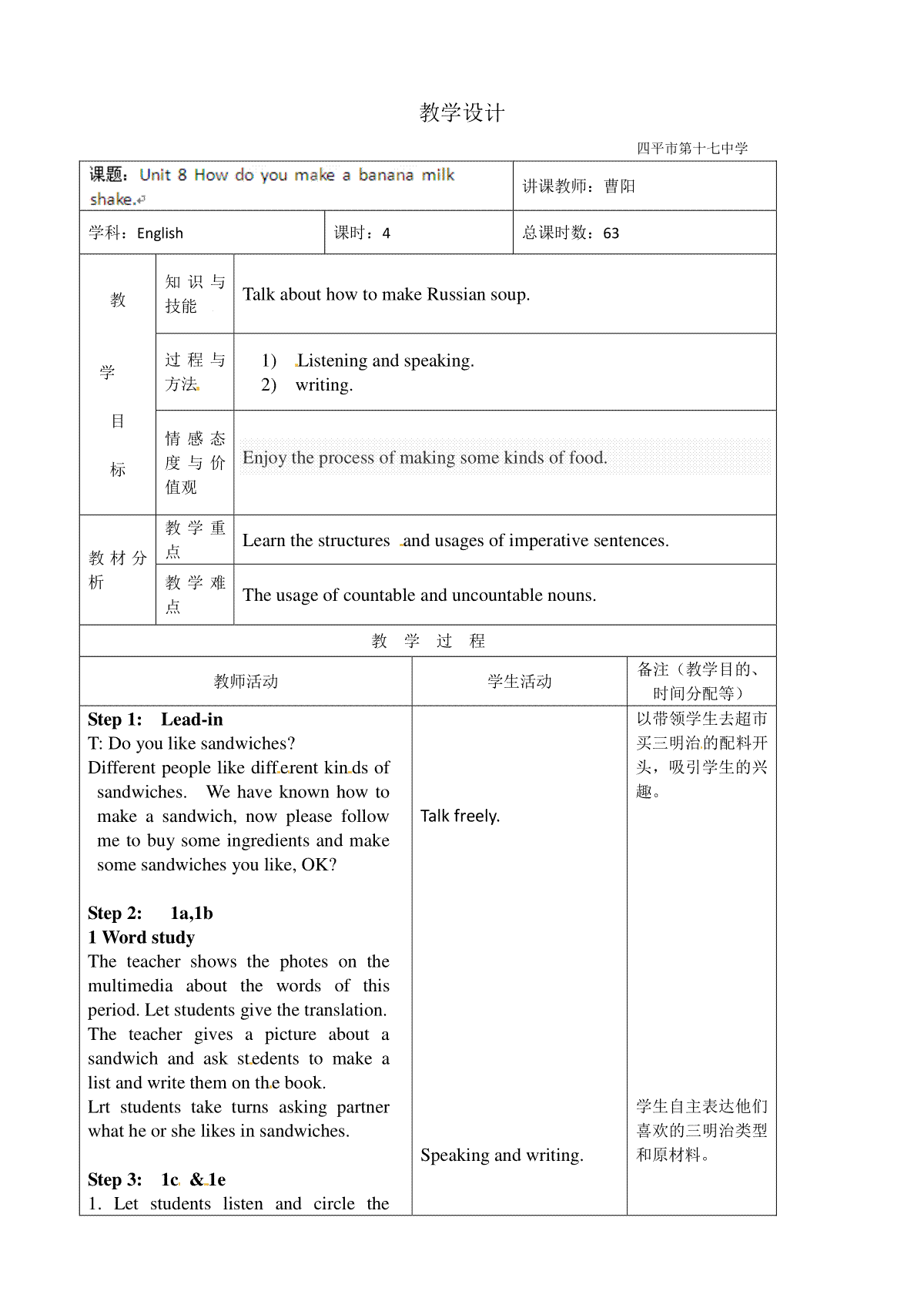4.八年级英语上册教案:Unit 8 How do you make a banana milk sha