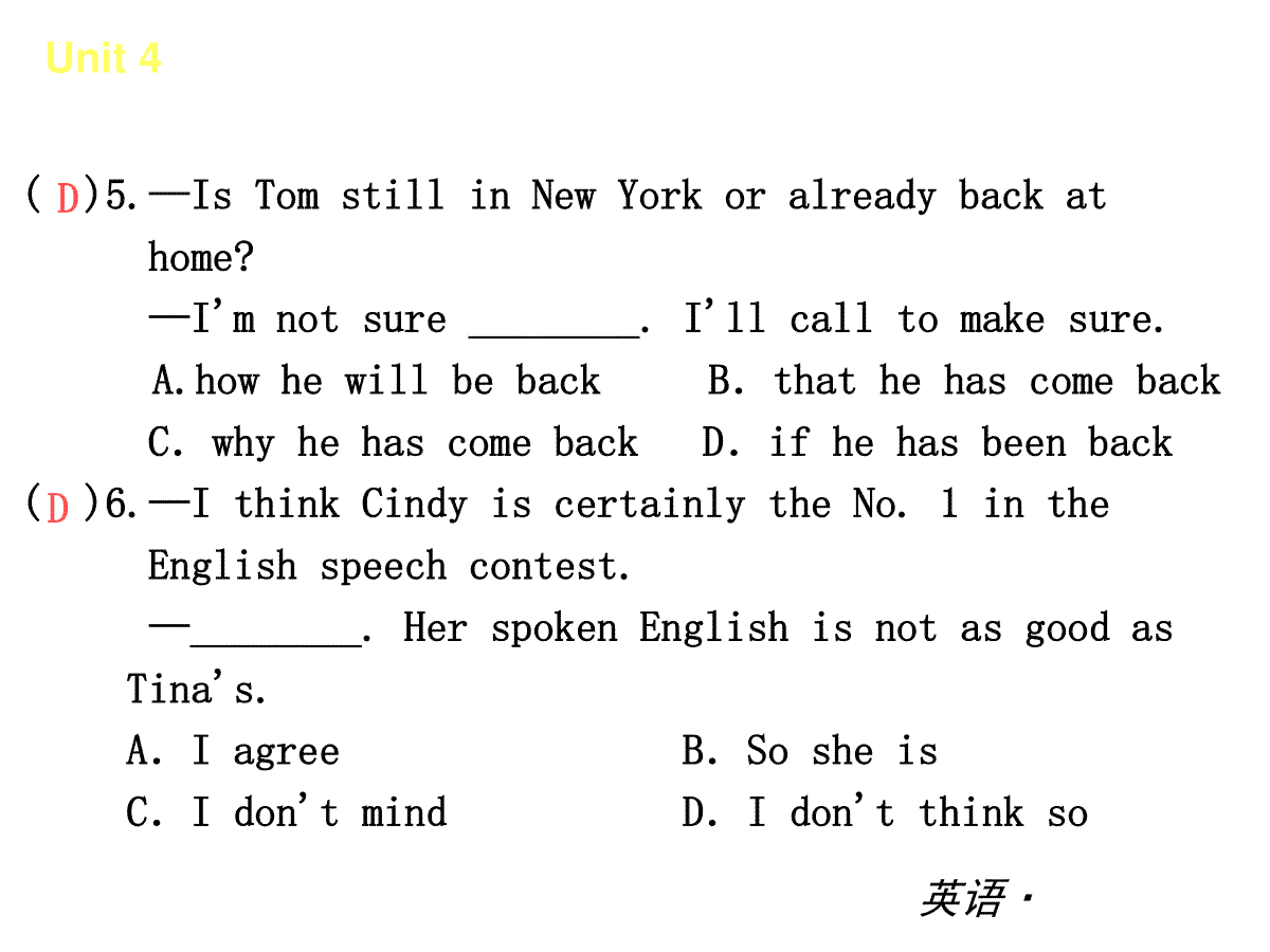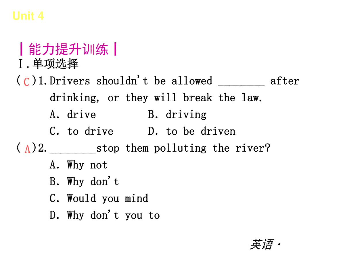 复习课件:(人教版)八年级英语下册 Unit 4 Why don’t you talk to you于近期开考,本次考试对考生对知识的掌握参考价值大,为了方便大家复习掌握错题!小编在下文为大家准备了复习课件:(人教版)八年级英语下册 Unit 4 Why don’t you talk to you试卷及答案解析详情,仅供考生参考。