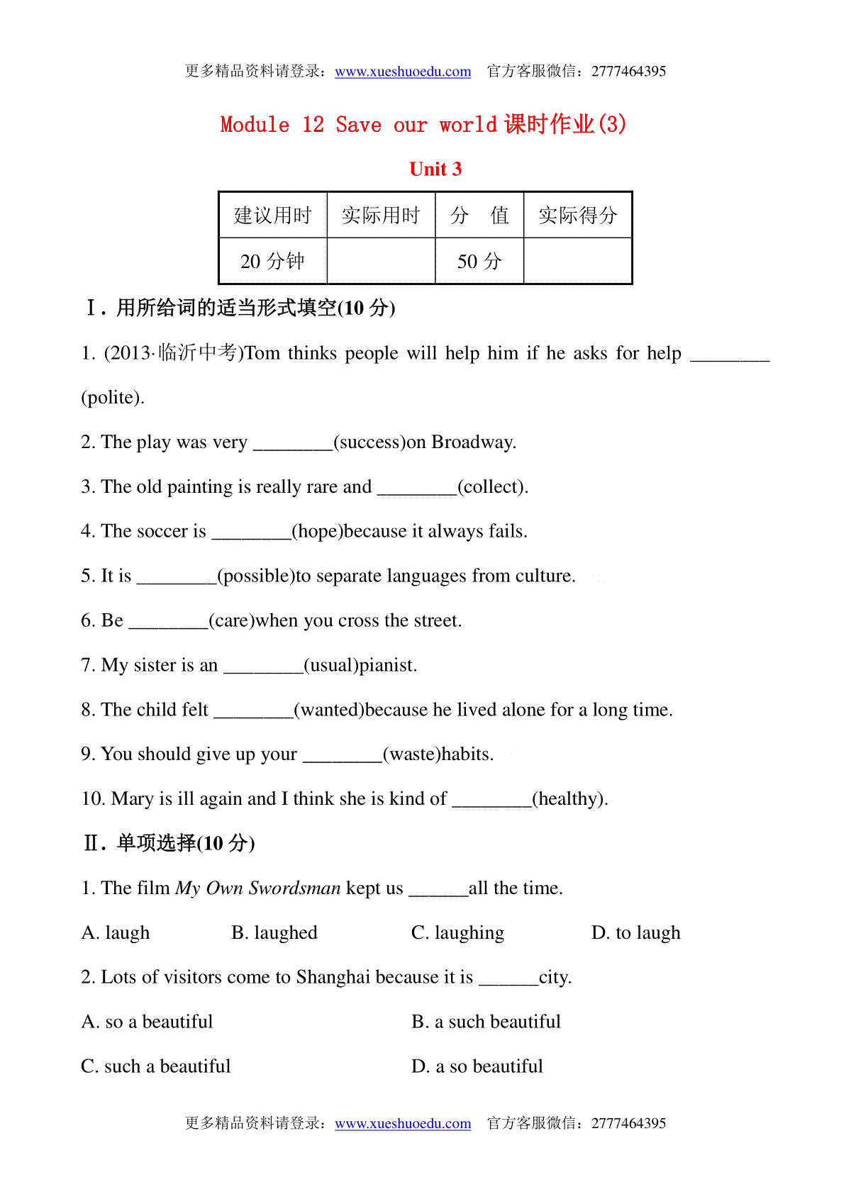Module 12 Save our world课时作业(3)于近期开考,本次考试对考生对知识的掌握参考价值大,为了方便大家复习掌握错题!小编在下文为大家准备了Module 12 Save our world课时作业(3)试卷及答案解析详情,仅供考生参考。