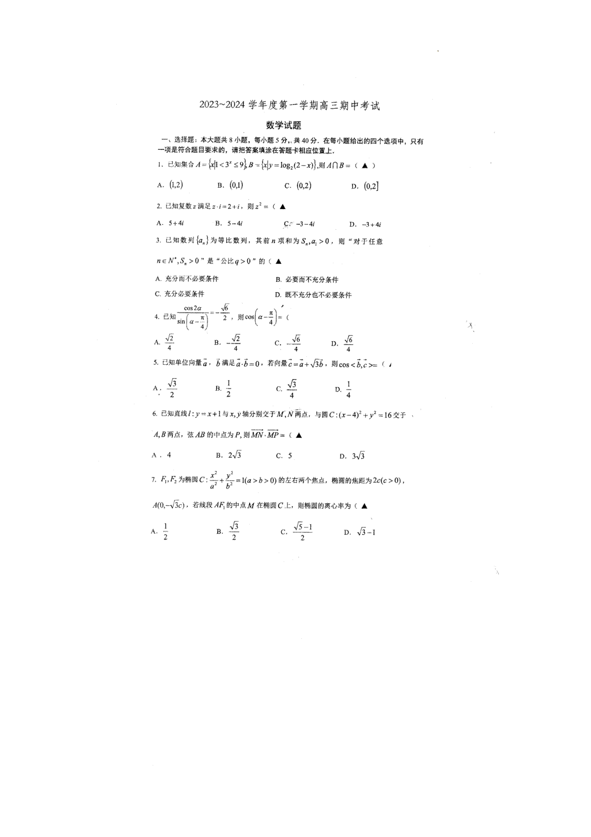 一、江苏省常州市2023-2024学年高三上学期期中数学试卷