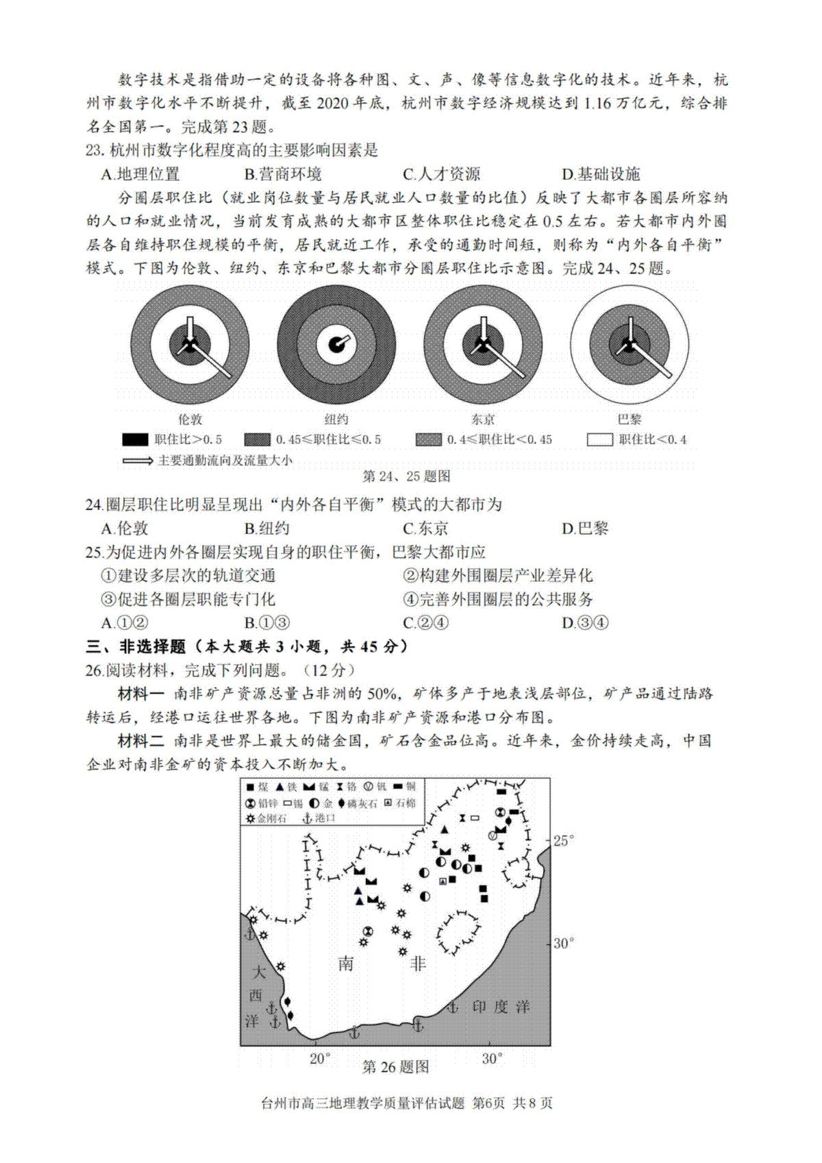 6.浙江省台州市2024届高三第一次教学质量评估台州一模(地理参考答案及评分标准)