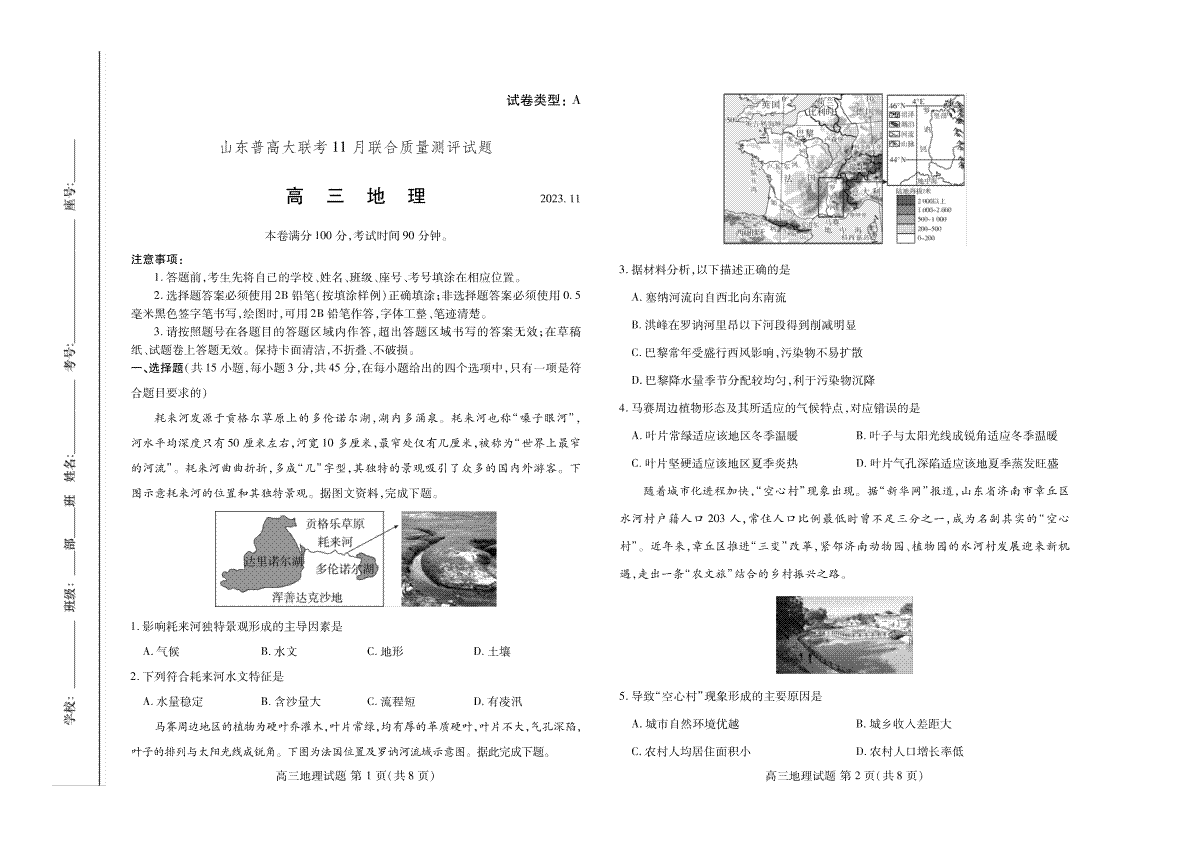 1.山东省普高大联考2023-2024学年高三上学期11月联合质量测评 地理