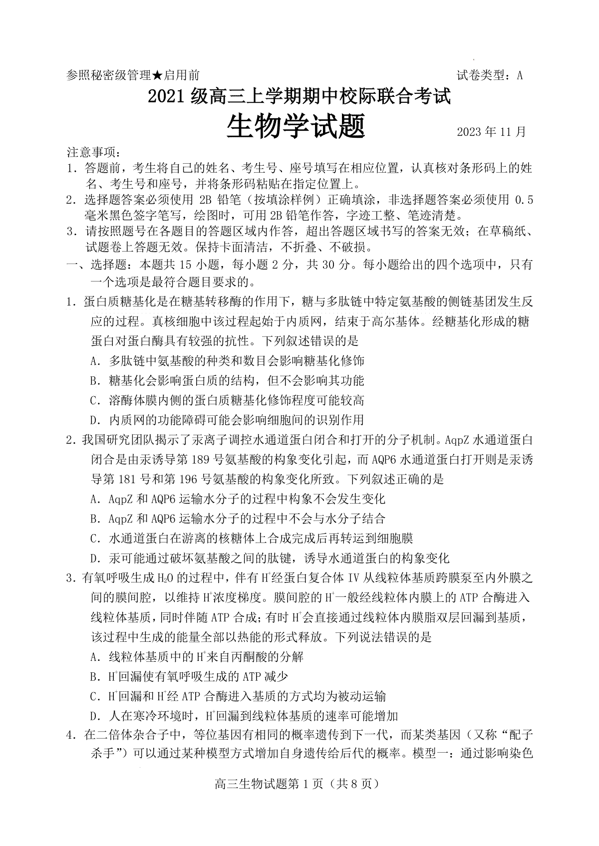 一、山东省日照市2021级高三上学期期中校际联合考试生物试题