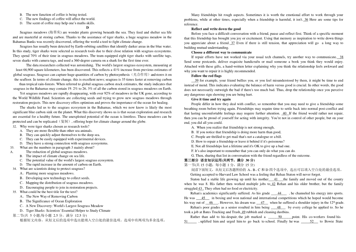 一、云南省曲靖市第一中学2023-2024学年高三上学期第四次月考 英语