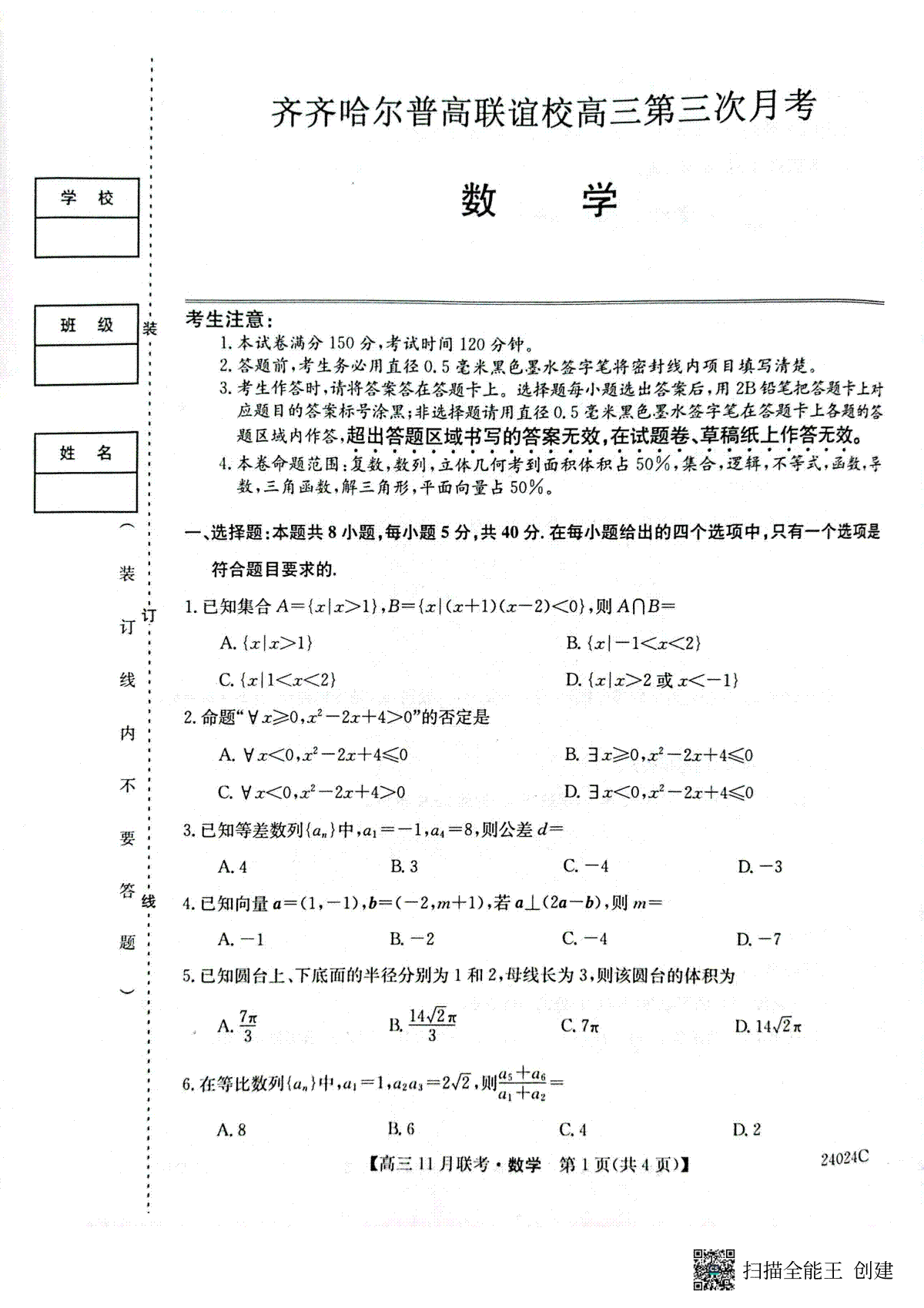 一、2024届齐齐哈尔普高联谊校高三第三次月考 数学