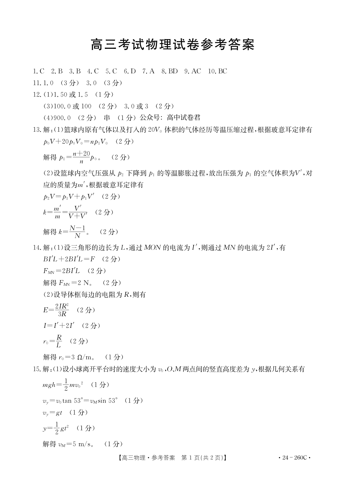 如果你想下载辽宁省县级重点高中协作体2023-2024学年高三上学期末考试物理答案DOC或PDF版,请点击本文末链接!