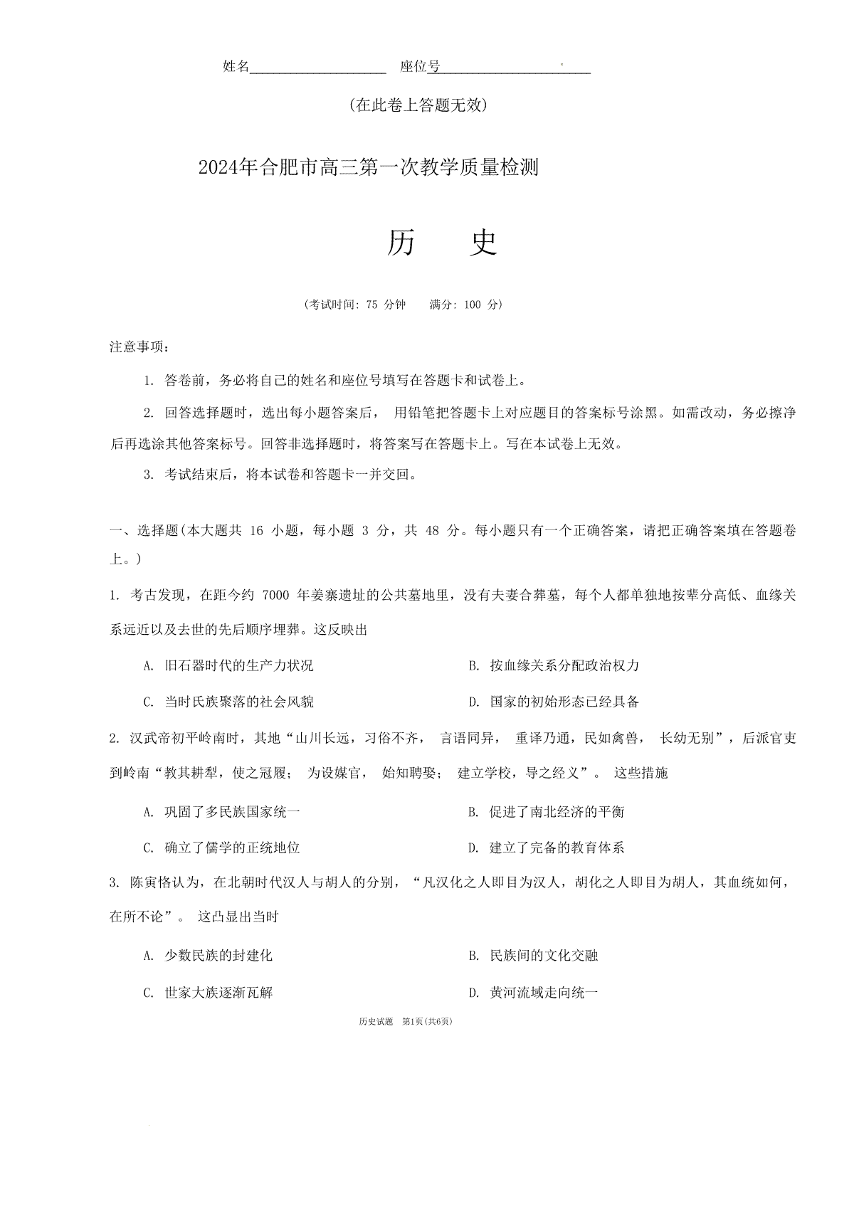 一、安徽省合肥市2024届高三第一次教学质量检查历史试题(含答)