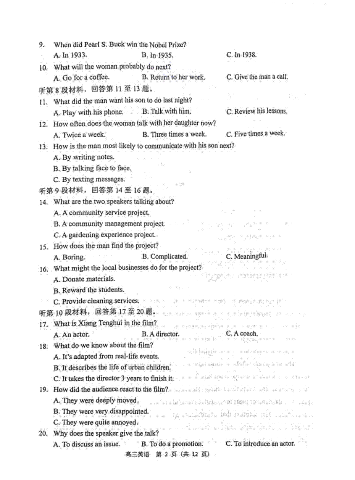8.江苏省苏锡常镇2024届高三一模英语答案