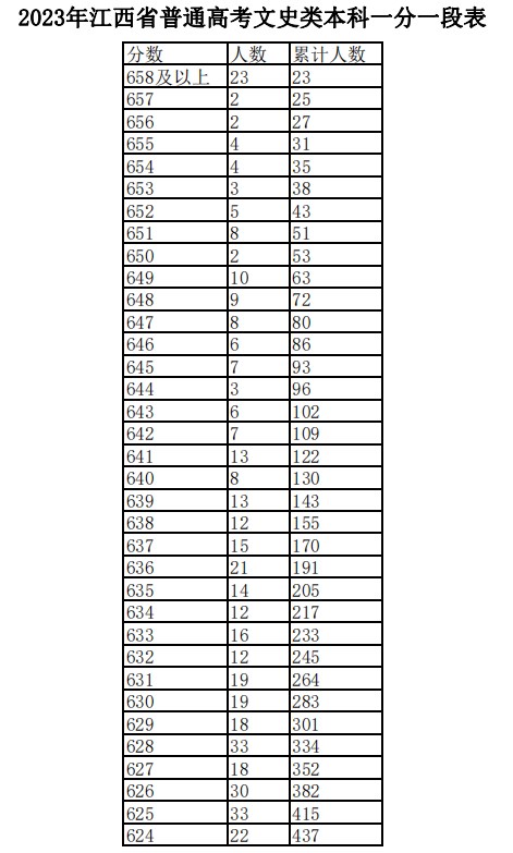 在“一分一段表”中查找与自己成绩相对应的分数排名和这一位次成绩共有多少考生,以确定个人成绩在全省的位置。然后看一下自己想要报考的大学往年在哪个段位,考生在知分、知线、知位的情况下,填报志愿更靠谱。2024年江西高考文科一分一段表还没有公布。以下是小编整理的2023年江西高考文科一分一段表,大家可以看一看。