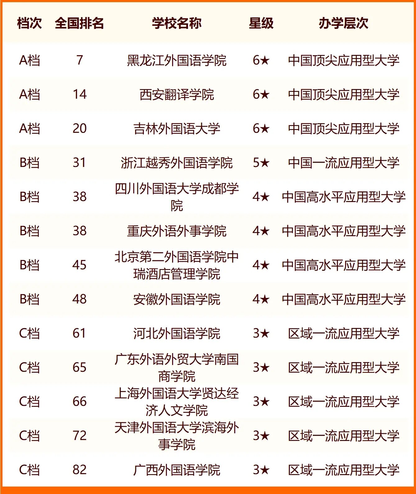 在2024中国外国语类民办大学最新排名中,黑龙江外国语学院全国排名第7、西安翻译学院全国排名第14、吉林外国语大学全国排名第20、浙江越秀外国语学院全国排名第31。
