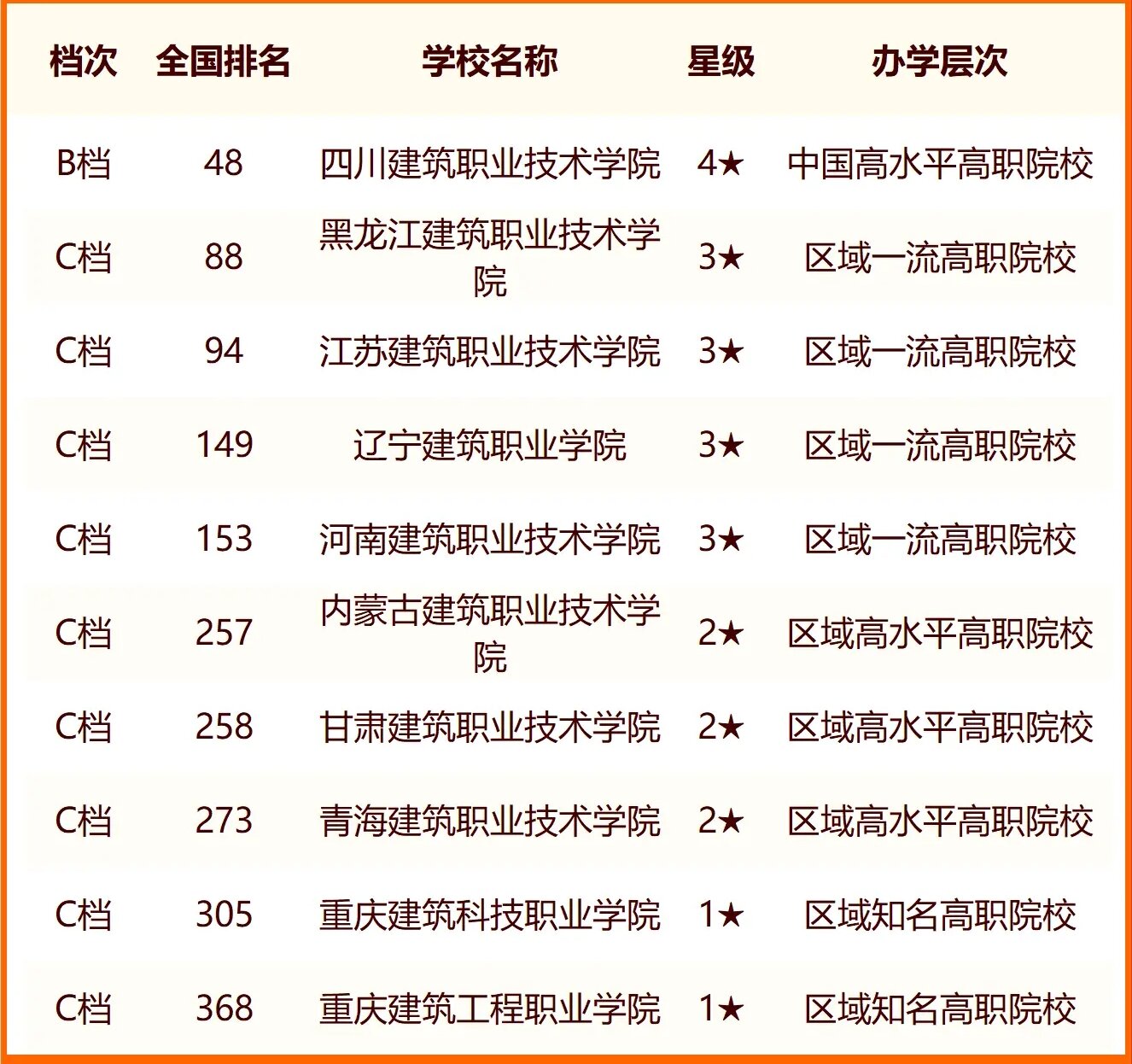 在2024中国建筑类高职院校最新排名中,四川建筑职业技术学院全国排名第48、黑龙江建筑职业技术学院全国排名第88、江苏建筑职业术学院全国排名第94、辽宁建筑职业学院全国排名第149。