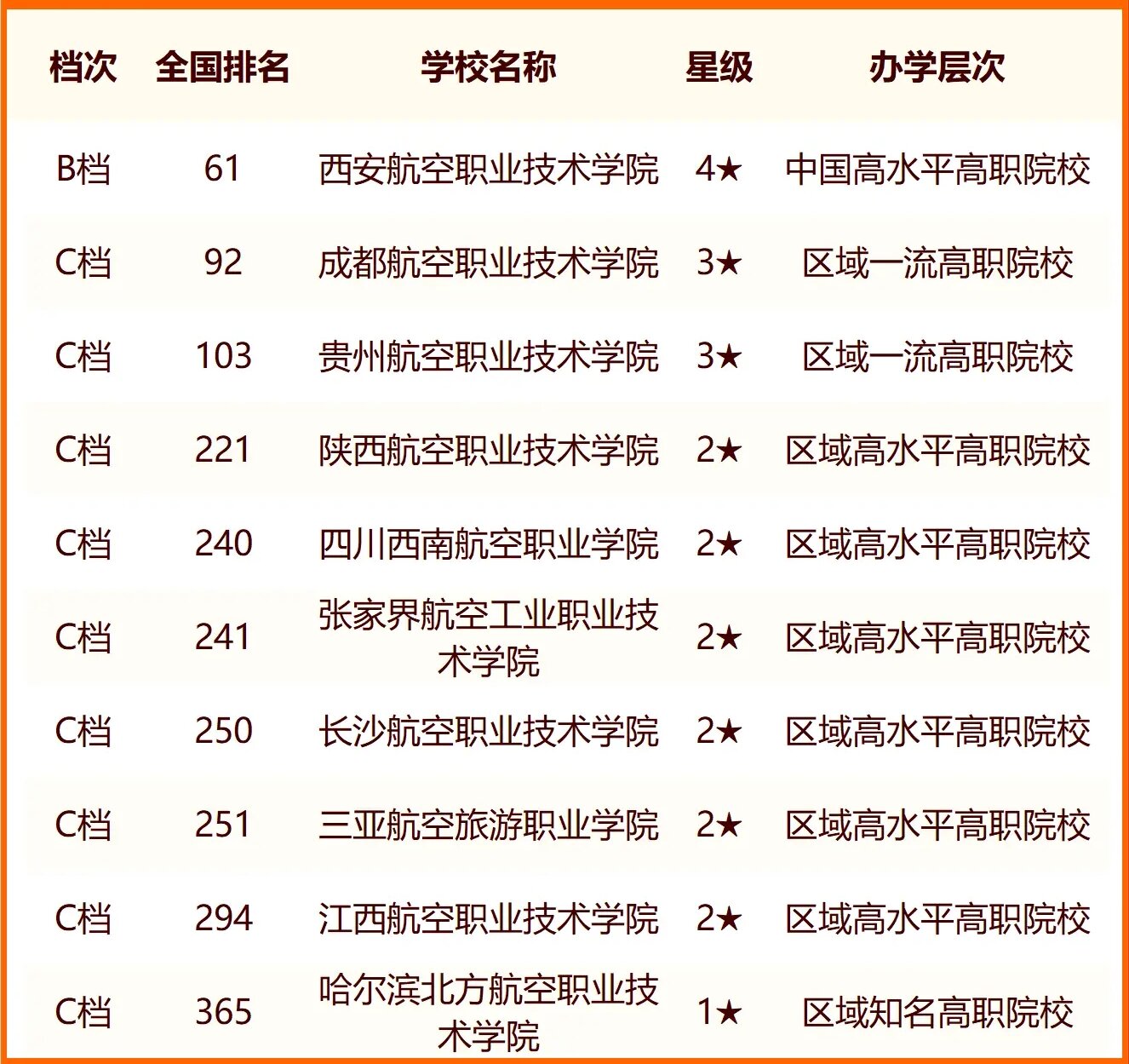 在2024中国航天航空类高职院校最新排名中,西安航空职业技术学院全国排名第61、成都航空职业技术学院全国排名第92、贵州航空职业技术学院全国排名第103、陕西航空职业技术学院全国排名第221。