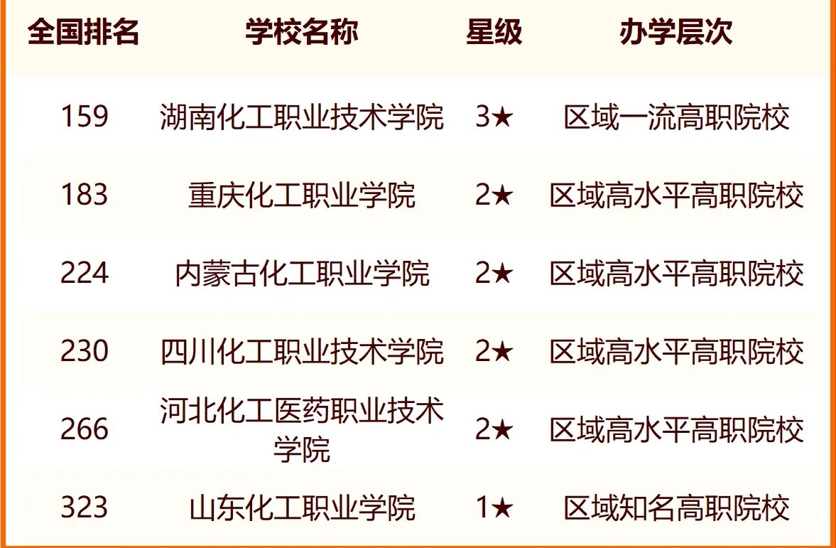 在2024中国化工类高职院校最新排名中,湖南化工职业技术学院全国排名第159、重庆化工职业学院全国排名第183、内蒙古化工职业学院全国排名第224、四川化工职业技术学院全国排名第230。