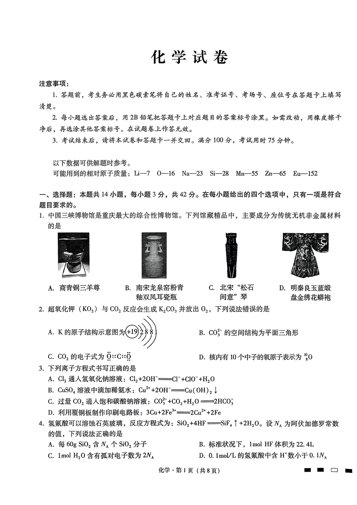 一、重庆市巴蜀中学2024届高考适应性月考卷(八)化学试题