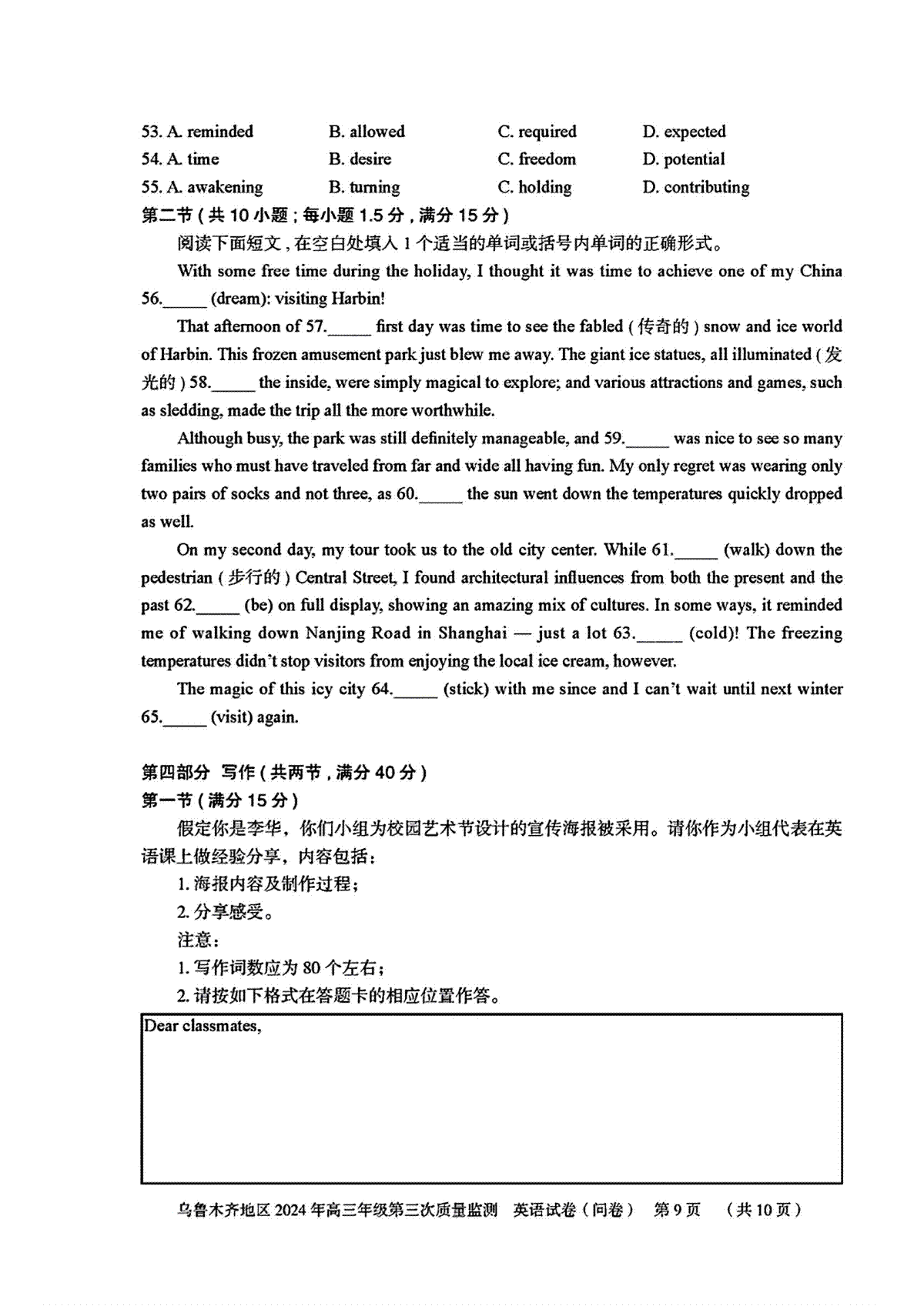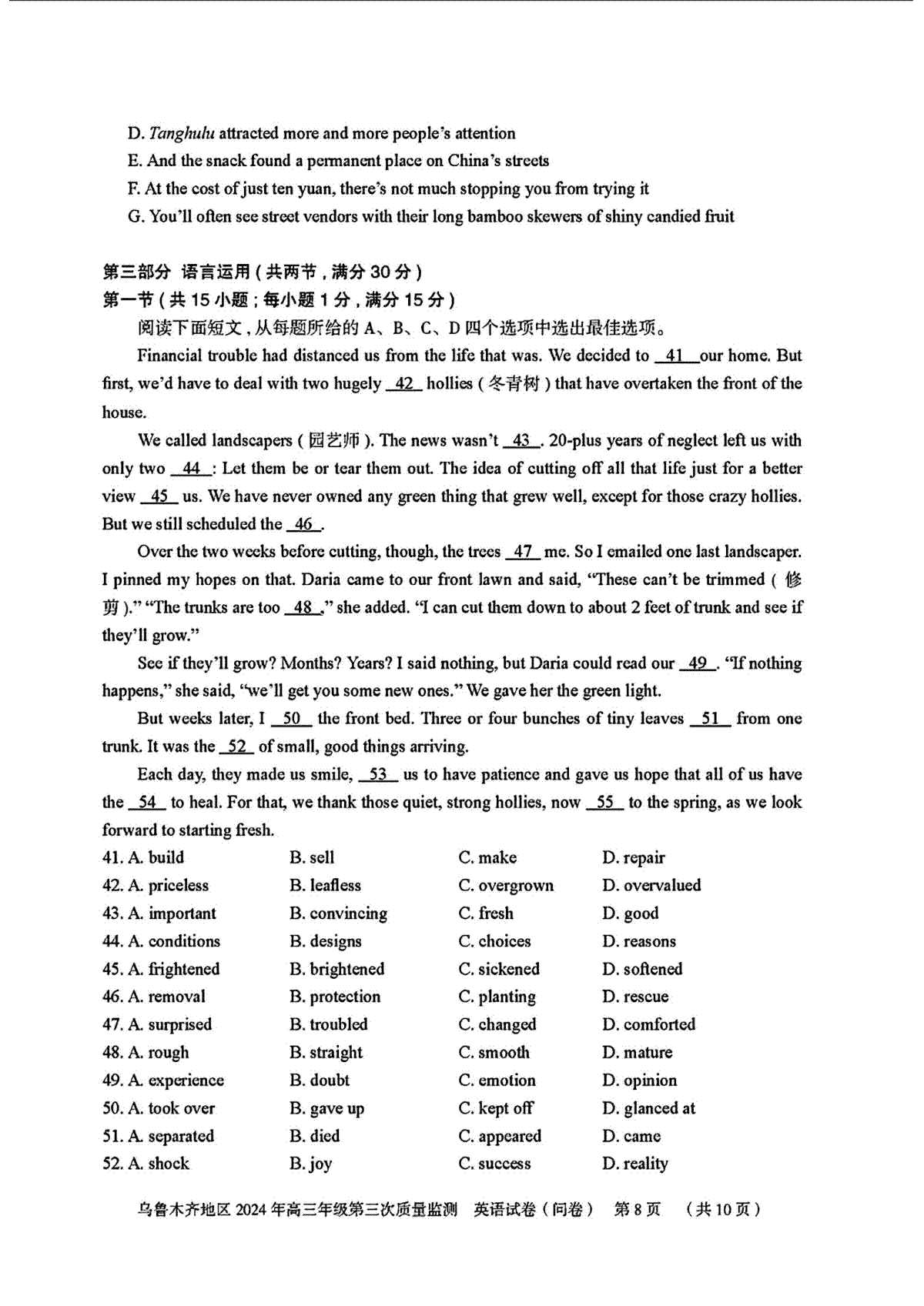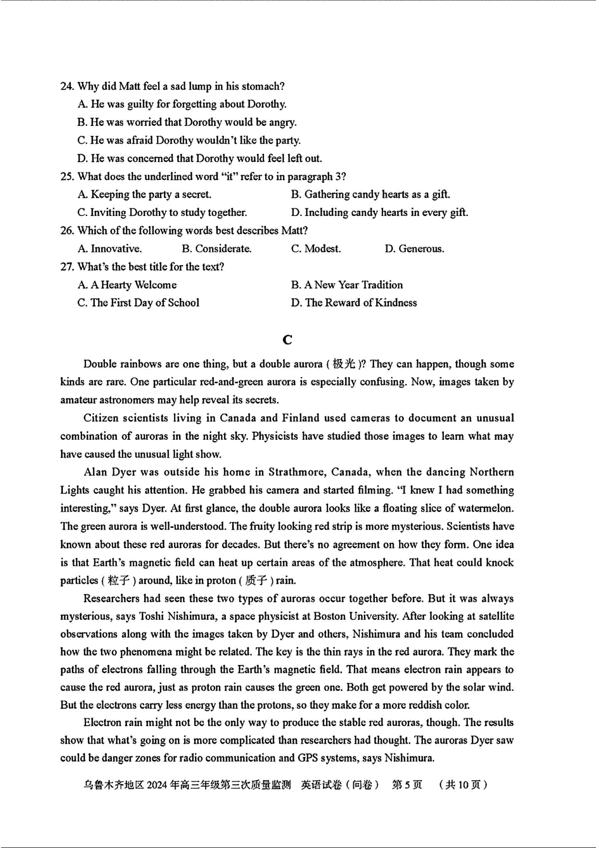 一、乌鲁木齐地区2024年高三年级第三次质量(三模)英语试题