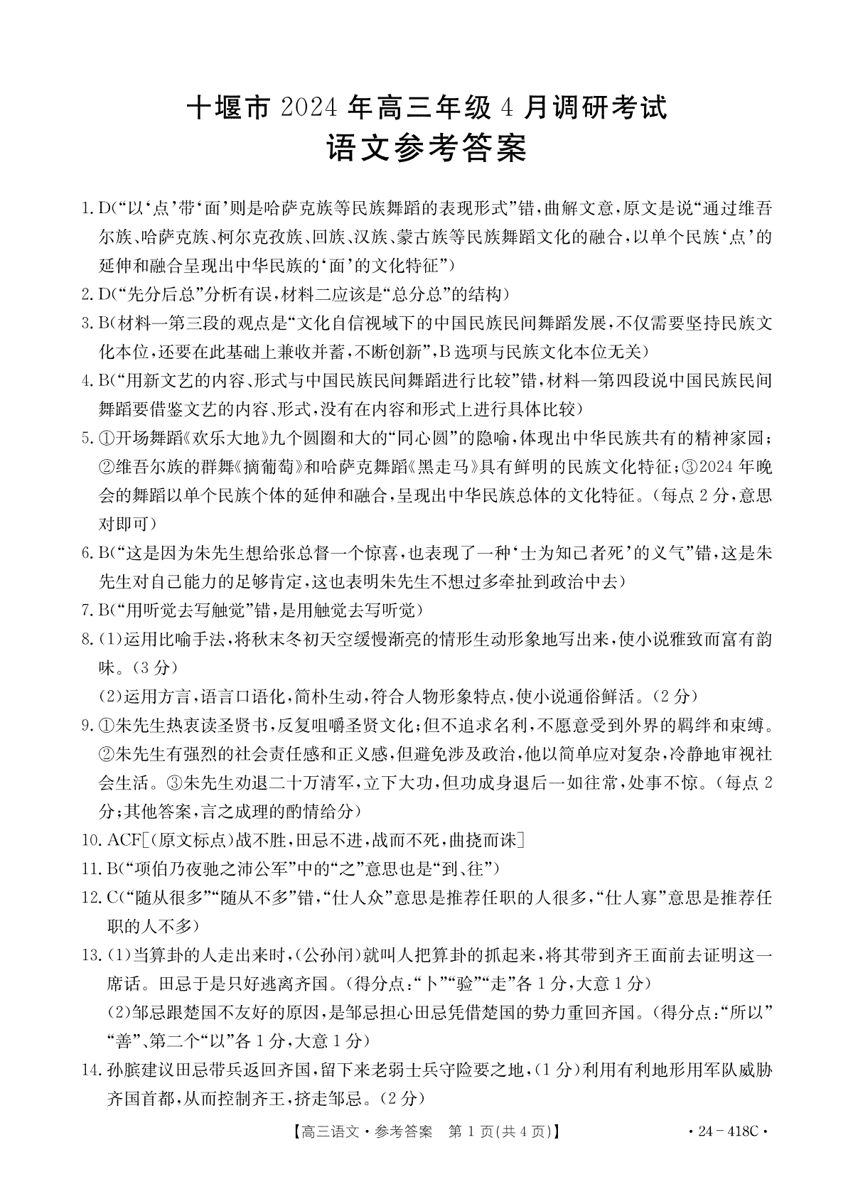 一、湖北省十堰市2023-2024学年高三下学期4月调研考试语文答案