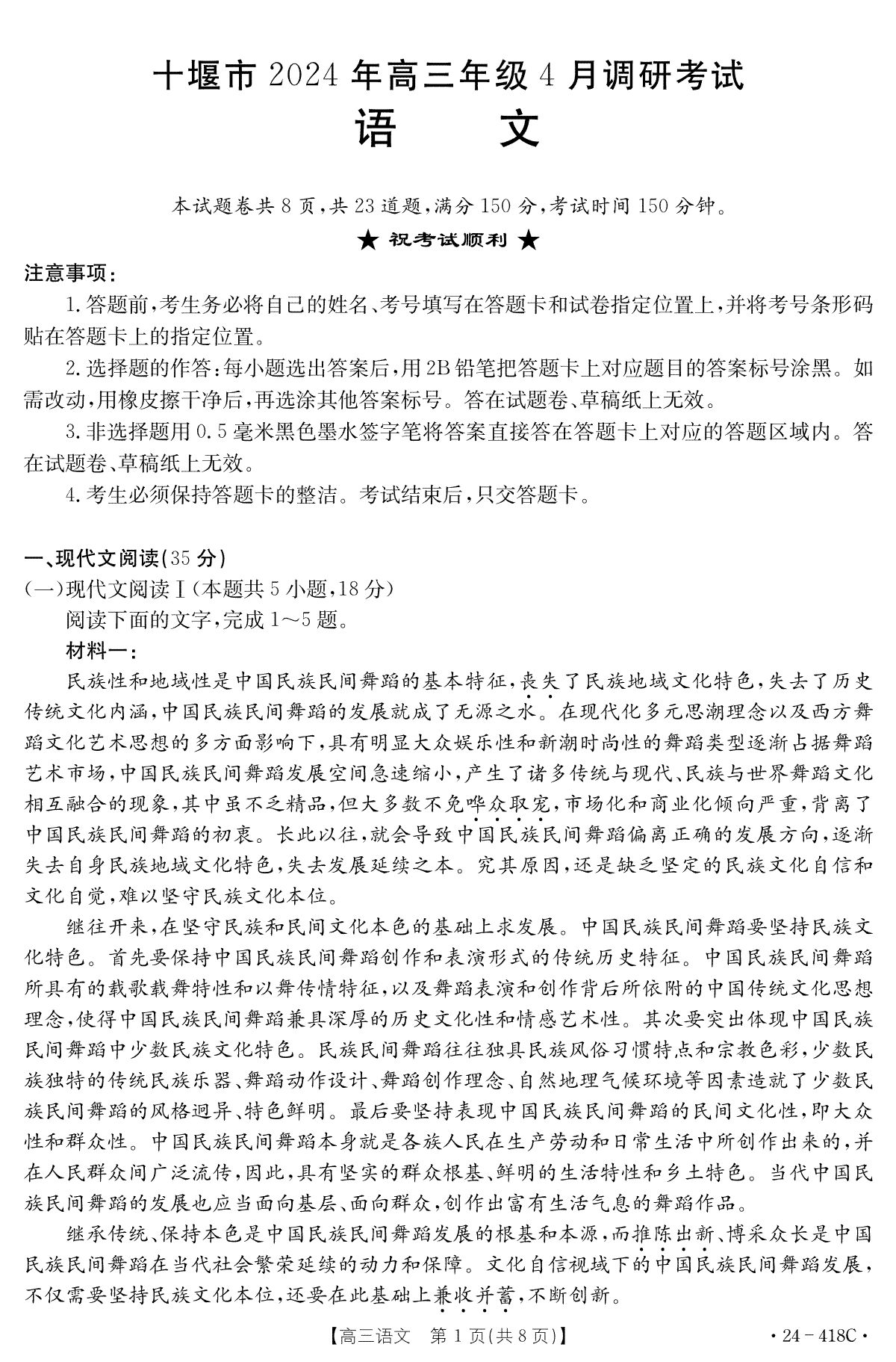 一、湖北省十堰市2023-2024学年高三下学期4月调研考试语文试题