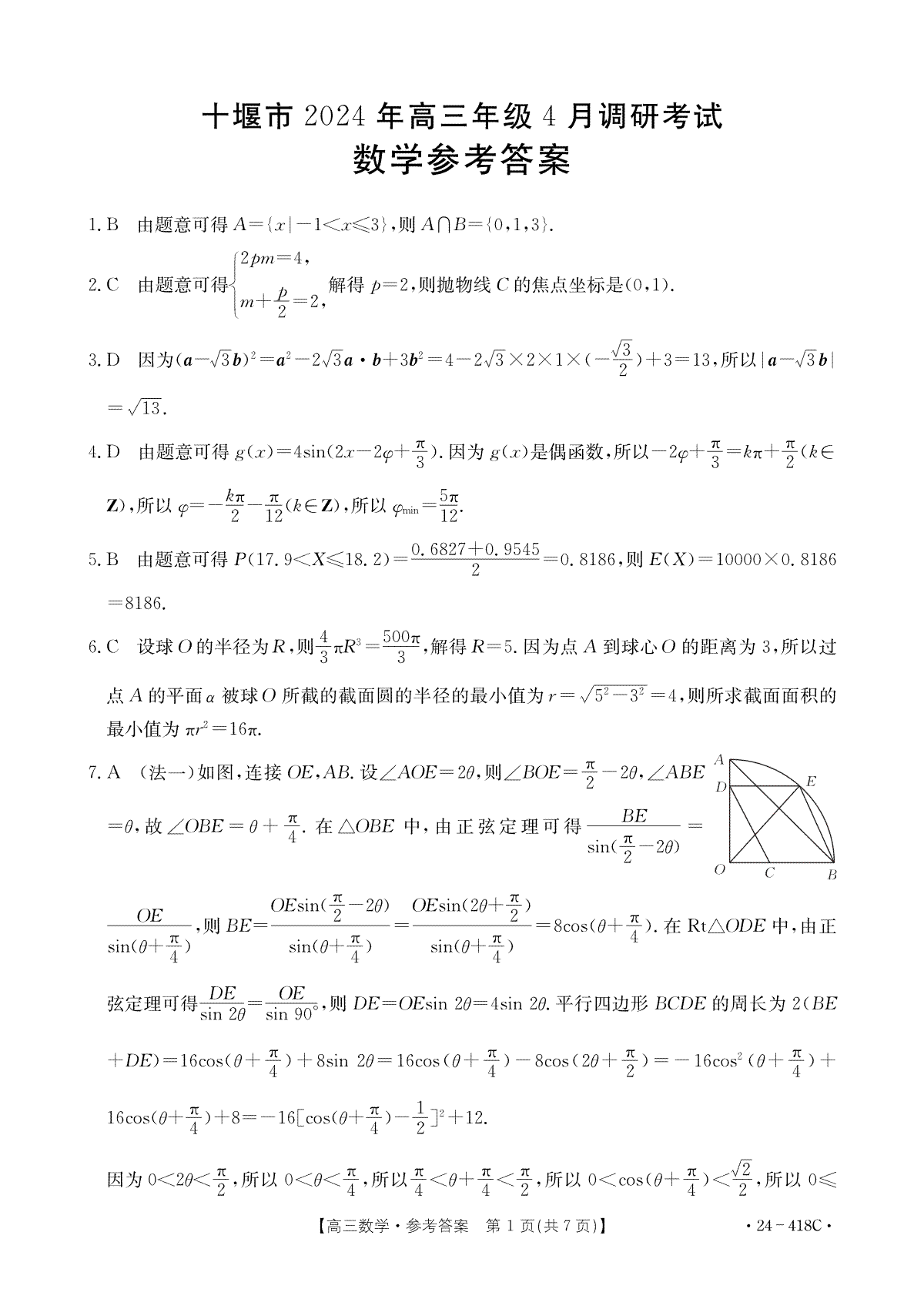 一、十堰市2024年高三4月调考数学答案