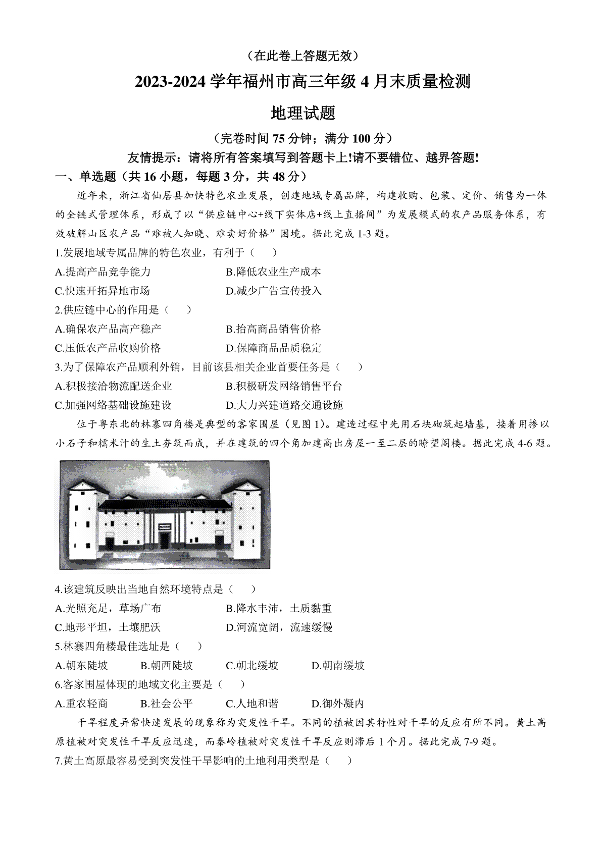 1.福建省福州市2023-2024学年高三下学期4月末质量检测地理试题(无答案)