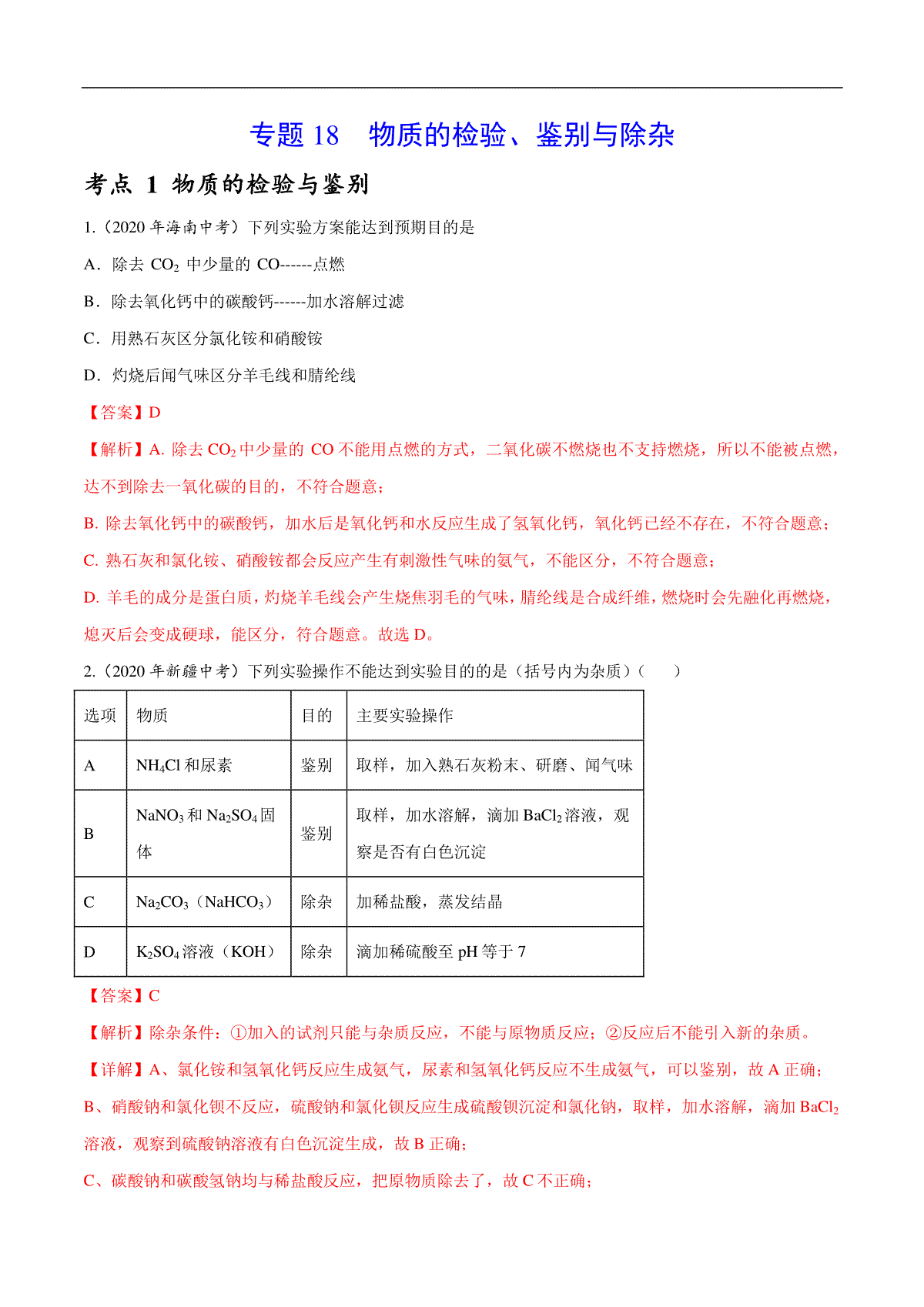 1.专题18 物质的检验、鉴别与除杂-2020年中考真题化学分项汇编(原卷版)