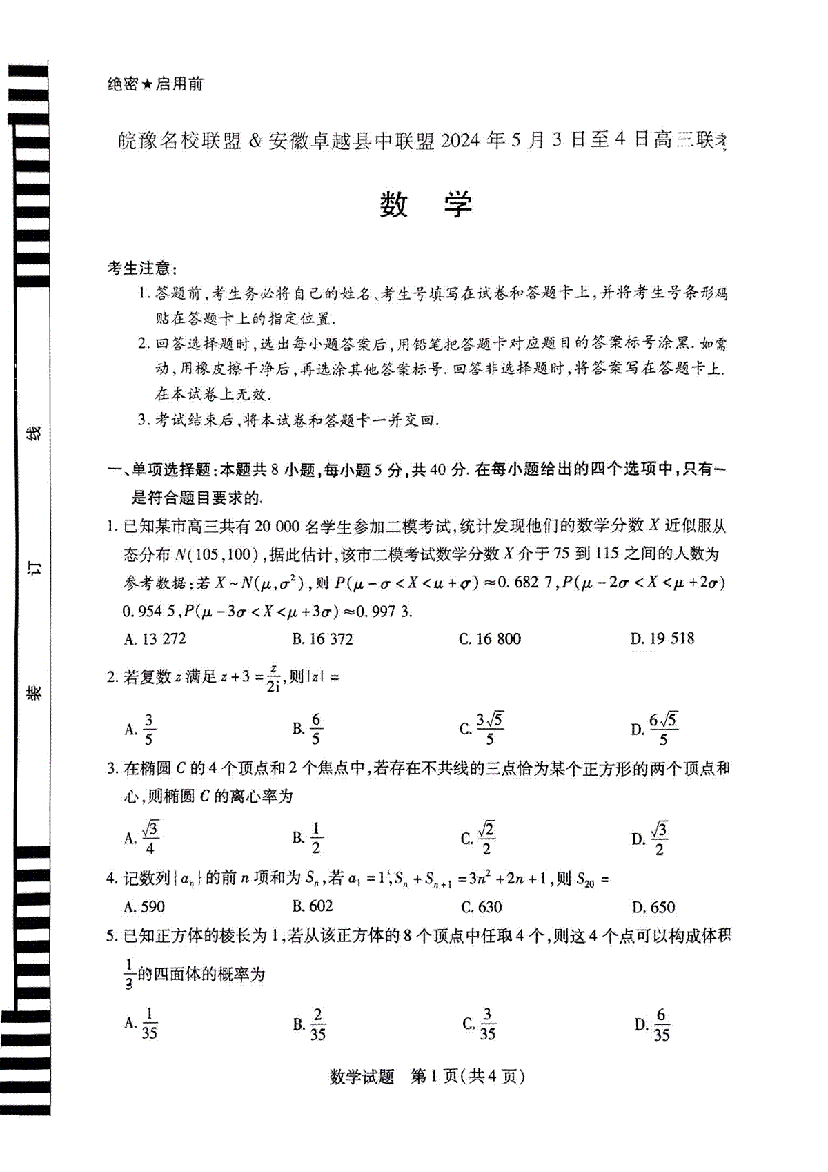 如果你想下载安徽省卓越县中联盟2024年高三三模联考数学试卷DOC或PDF版,请点击本文末链接!
