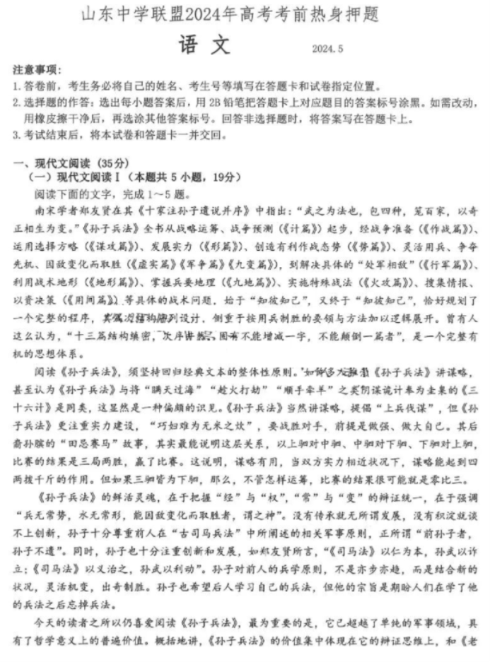 2024山东中学联盟高考考前热身押题充分考虑了高考的特点,能有效地提升复习效率、积累考试经验,具有较大的参考价值。为方便大家复习,小编在下文为大家整理了山东中学联盟2024高考考前热身押题的语文试题及答案,供大家查看!