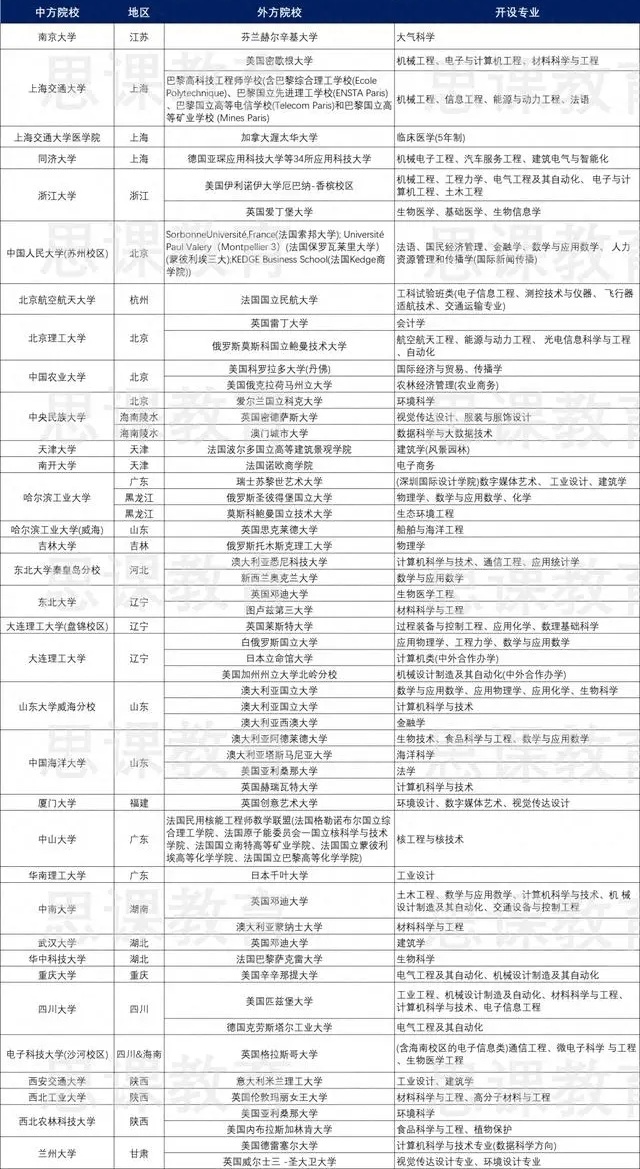 中外合作办学985高校包括清华大学、北京大学、复旦大学、上海交通大学、浙江大学、南京大学、中国科学技术大学、中山大学、华南理工大学等。