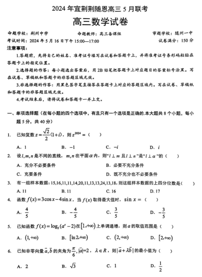 1.九师联盟2024高三5月考前押题(新高考)数学试题及答案解析