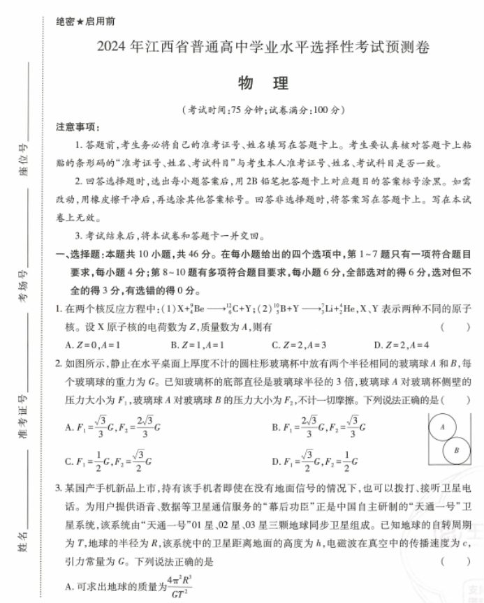 1.王后雄2024高考押题预测卷(江西版)物理试题及答案解析