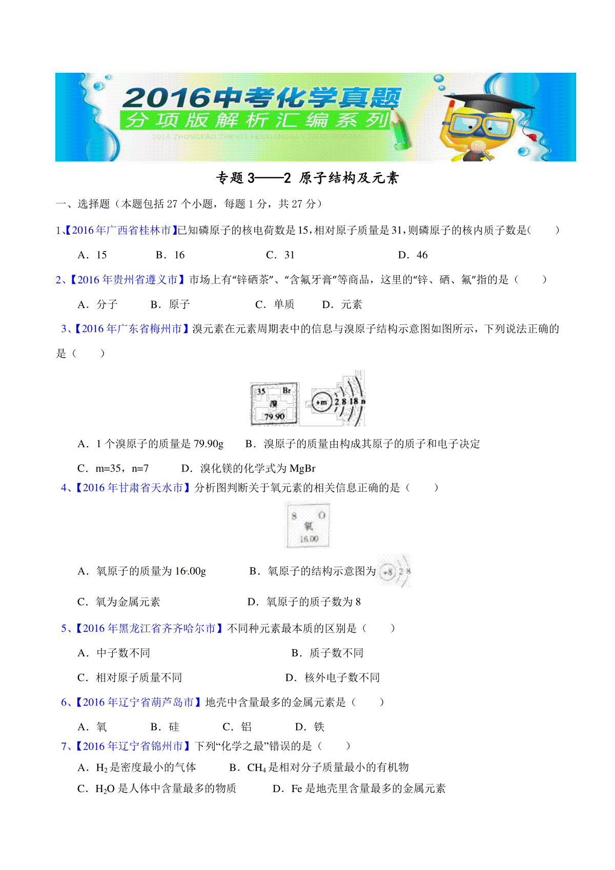 专题3.2 原子结构及元素(第03期)-2016年中考化学试题分项版解析汇编(原卷版)