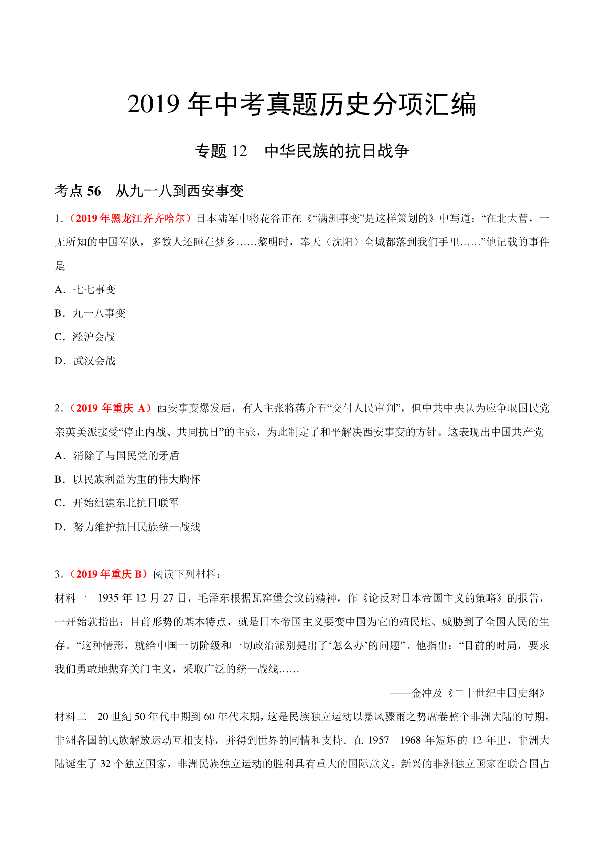 专题12 中华民族的抗日战争(第01期)-2019年中考真题历史试题分项汇编(原卷版)