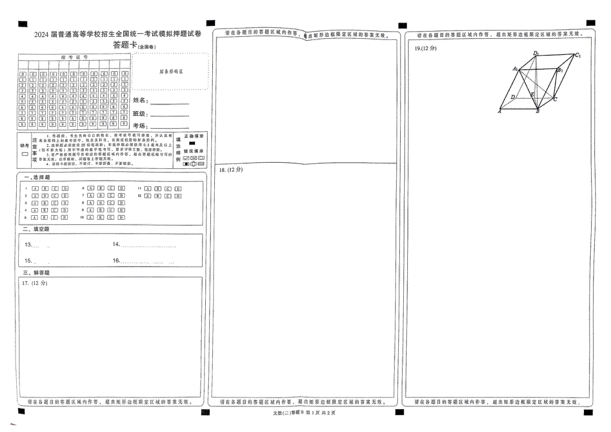 2024届普通高等学校招生全国统一考试模拟押题(二)(全国卷)文数(二)答题卡(1)