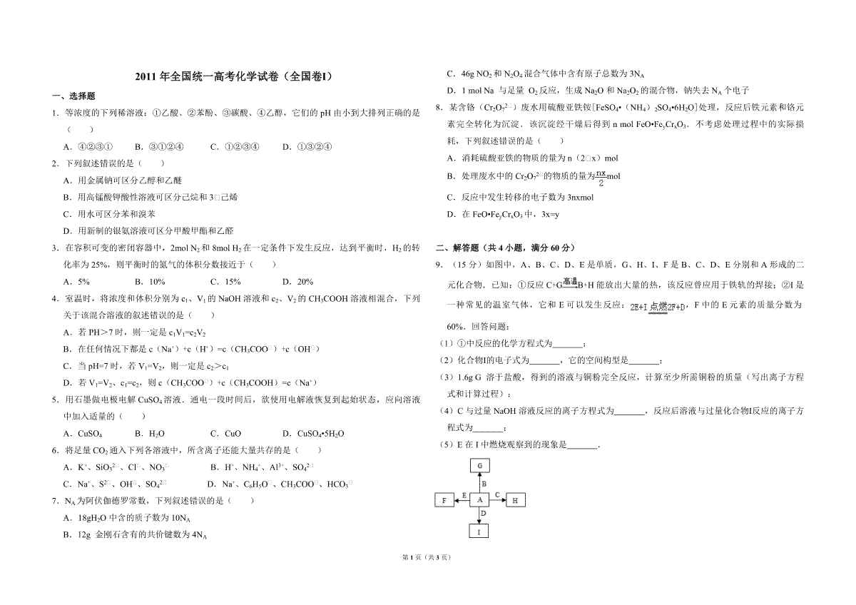 2011年全国统一高考化学试卷(全国卷ⅰ)(原卷版)