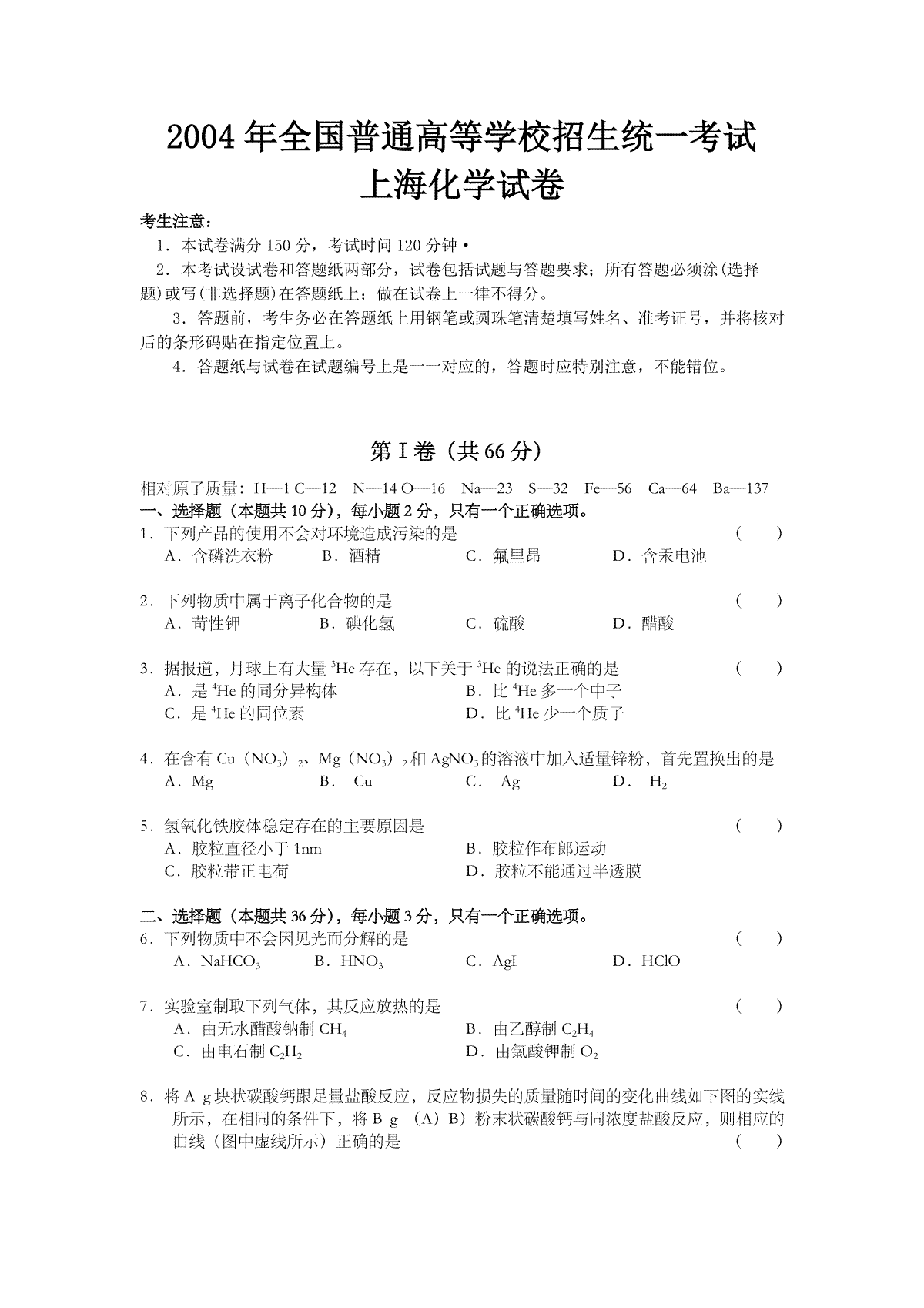 2004年上海高考数学真题(文科)试卷(原卷版)