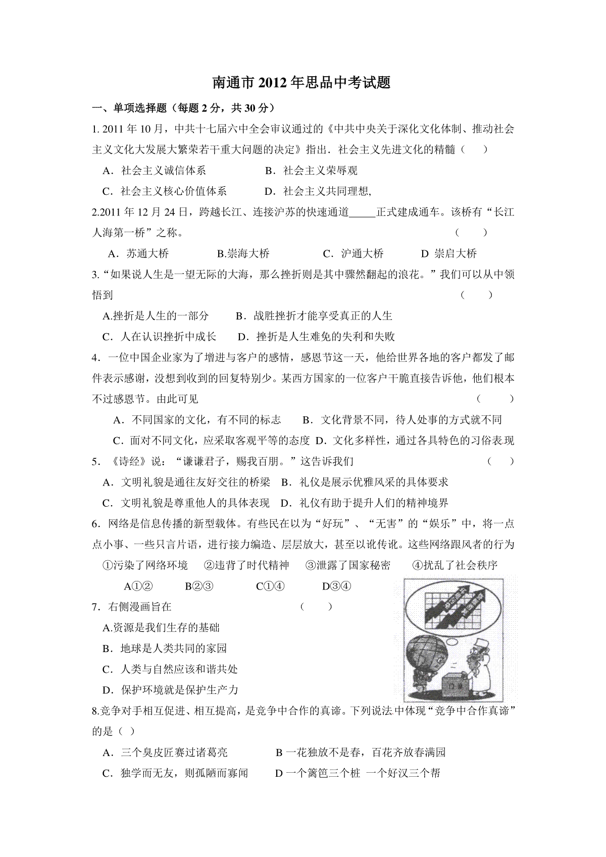 江苏省南通市2012年中考思想品德试题(word版-含答案)