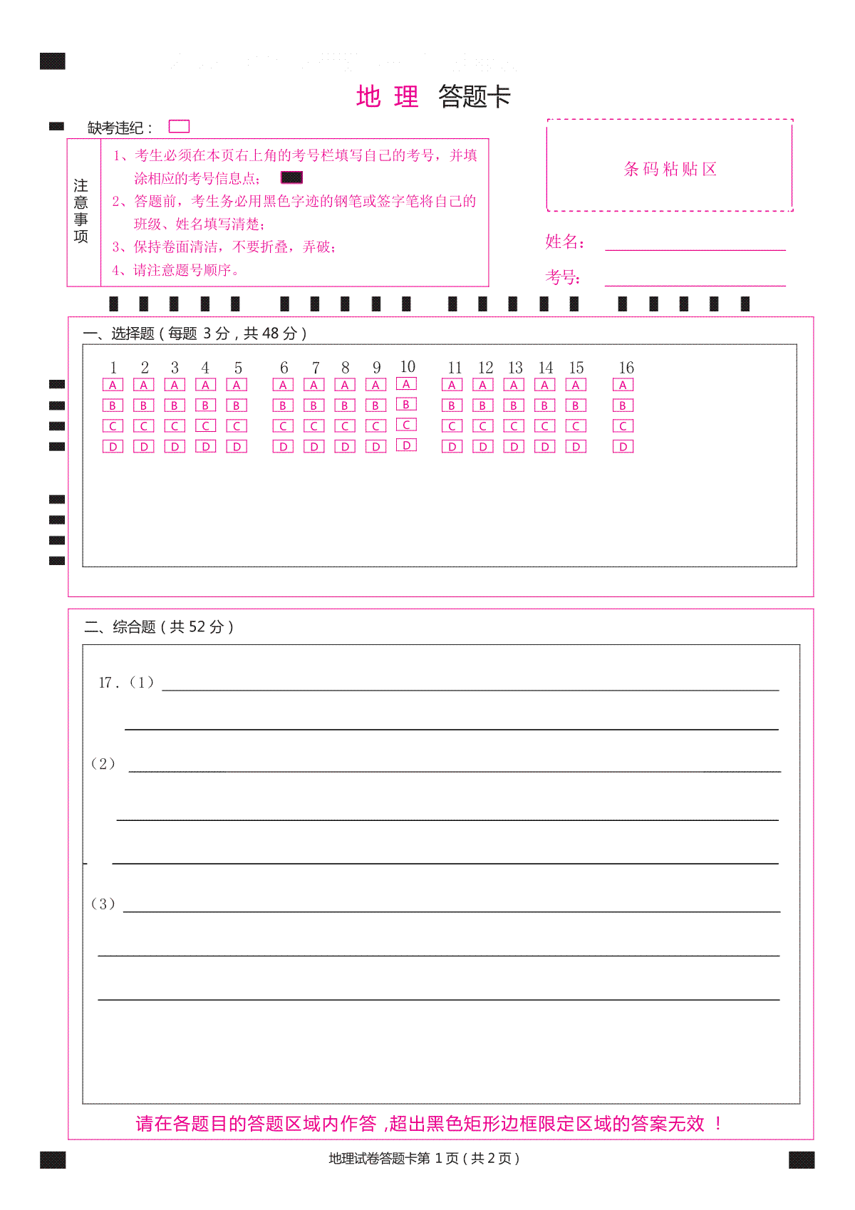 黑龙江省牡丹江市普通高中协同发展共同体2024届高三下学期第一次模拟考试地理答题卡