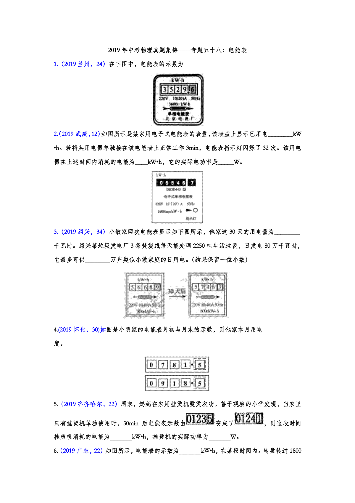 2019年中考物理真题集锦——专题五十八:电能表(word版含答案)