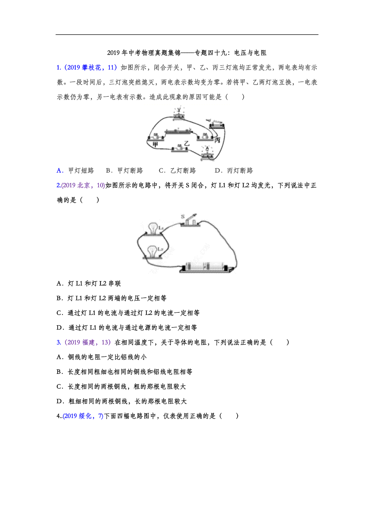 2019年中考物理真题集锦——专题四十九:电压与电阻(word版含答案)