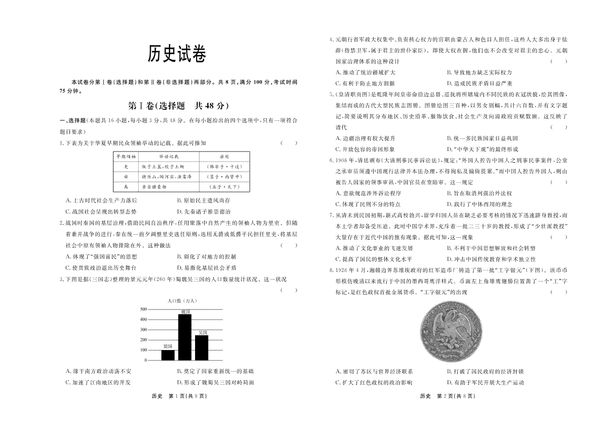 河北省部分高中2024届高三下学期一模试题 历史 PDF版含答案