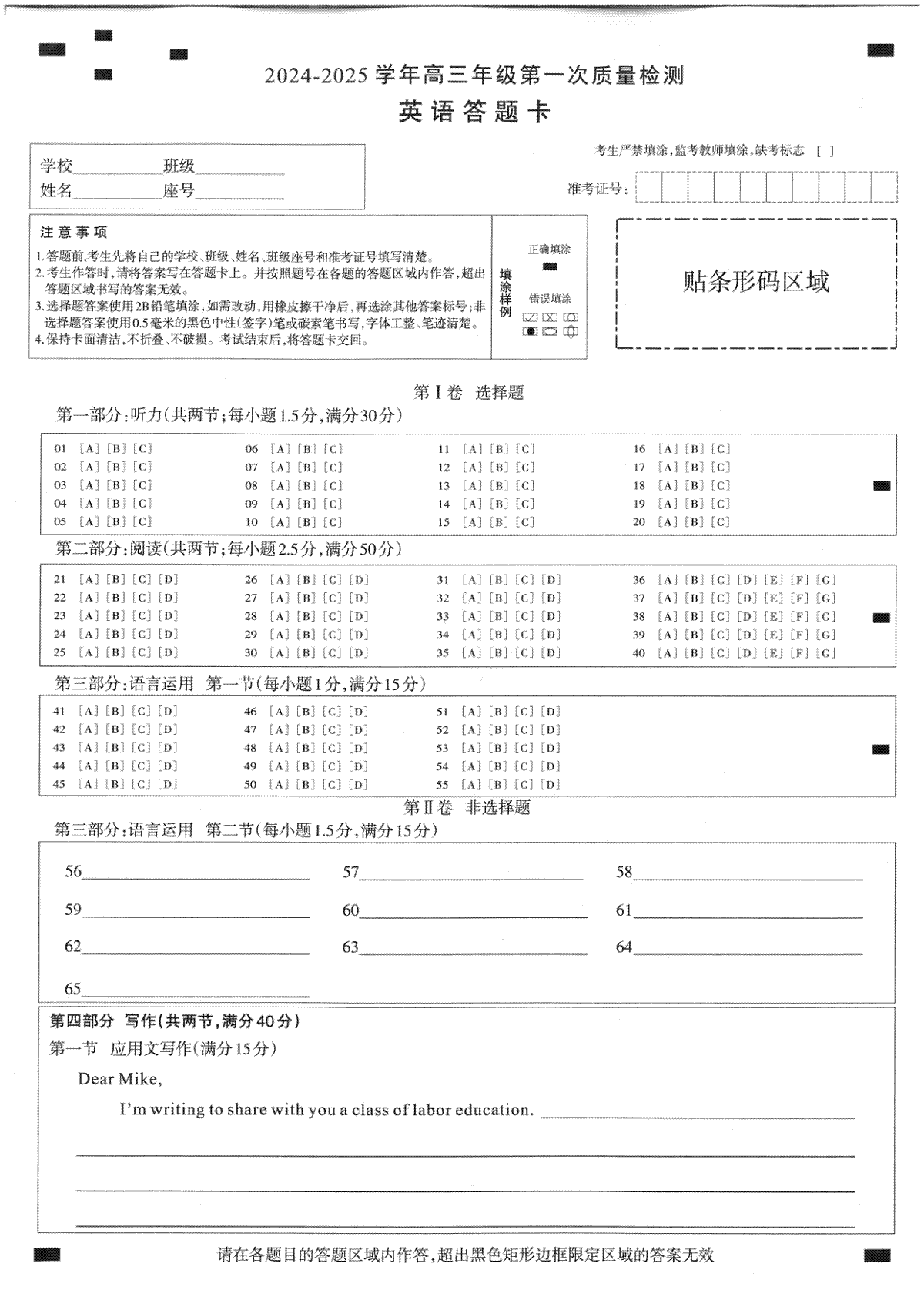 福建省福州市2024-2025学年高三年级上学期第一次质量检测英语试卷答题卡