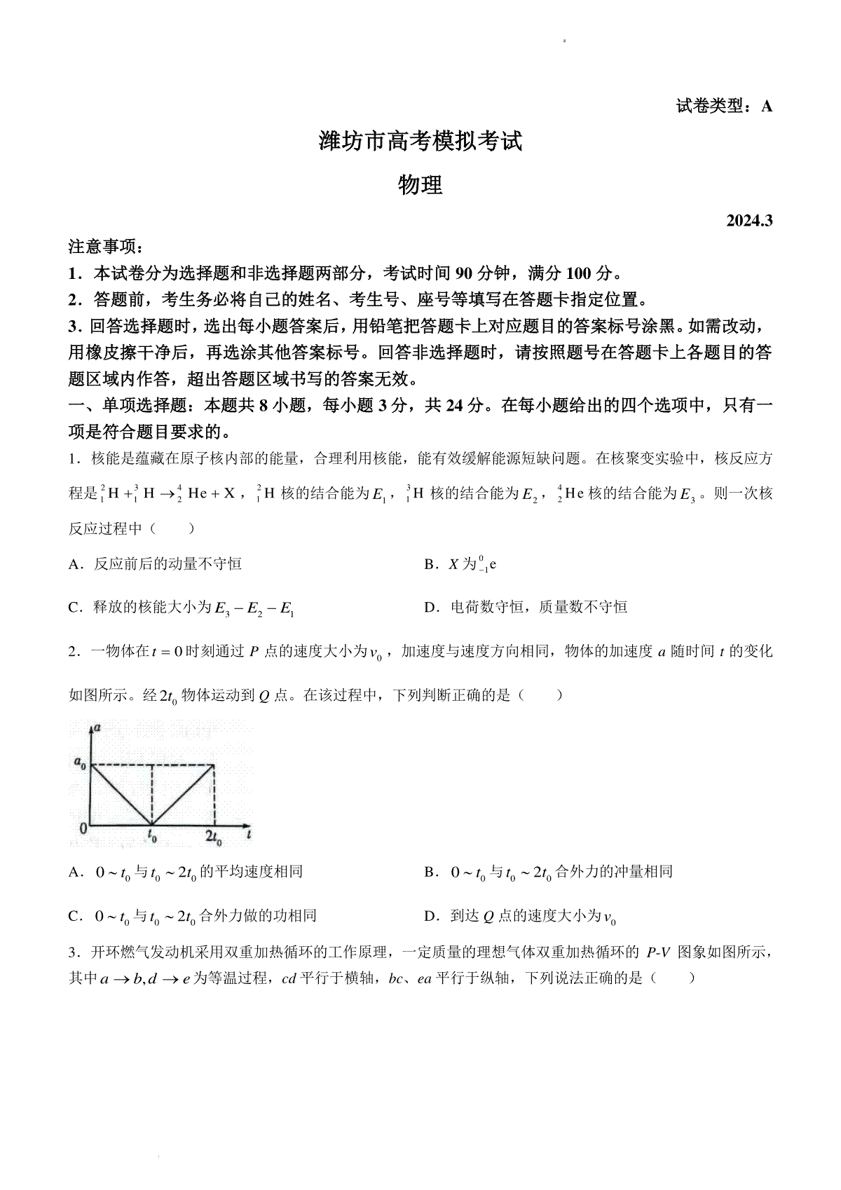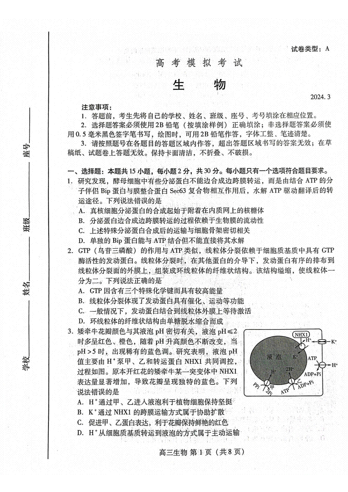 2024届山东省潍坊市滨州市高三一模生物试卷