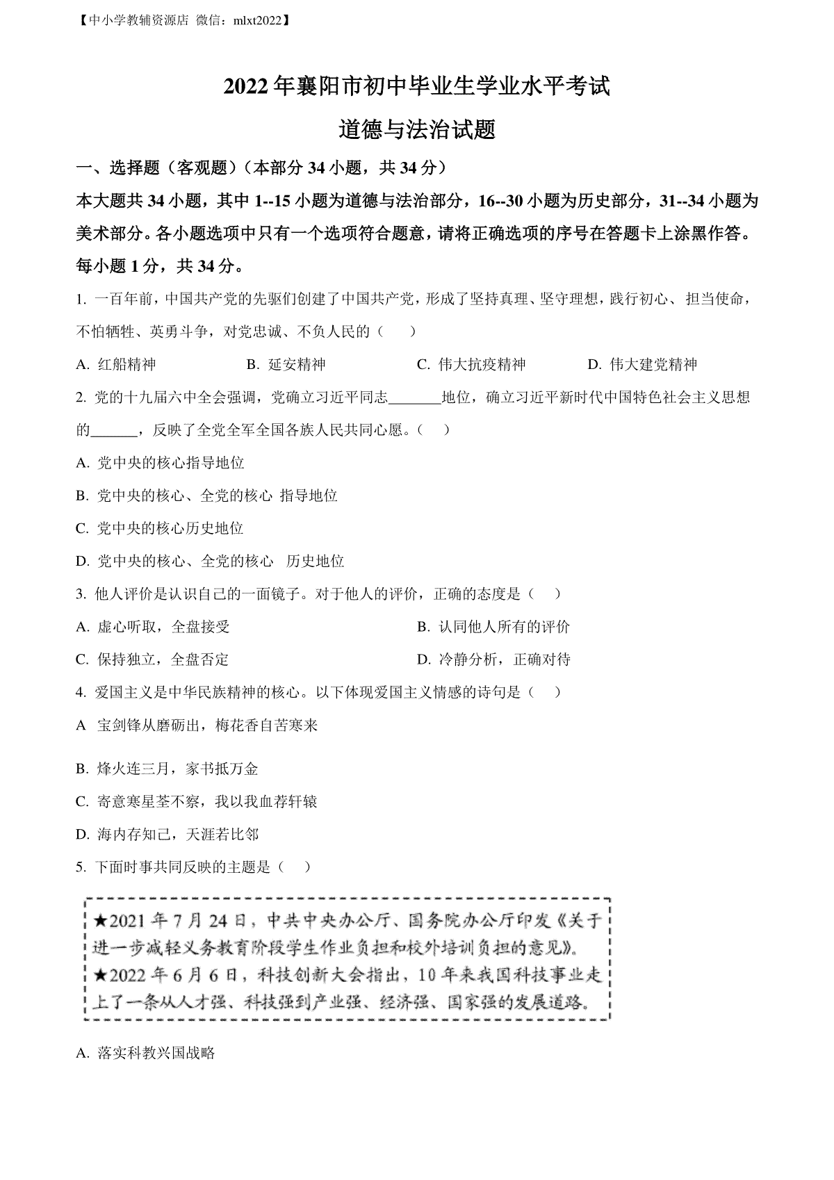 精品解析:2022年湖北省襄阳市中考道德与法治真题(原卷版)