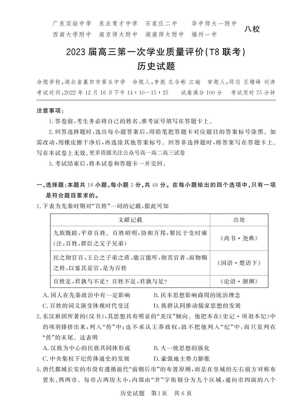 【湖北、河北】2023届T8联考历史(湖北省襄阳市第五中学命制)