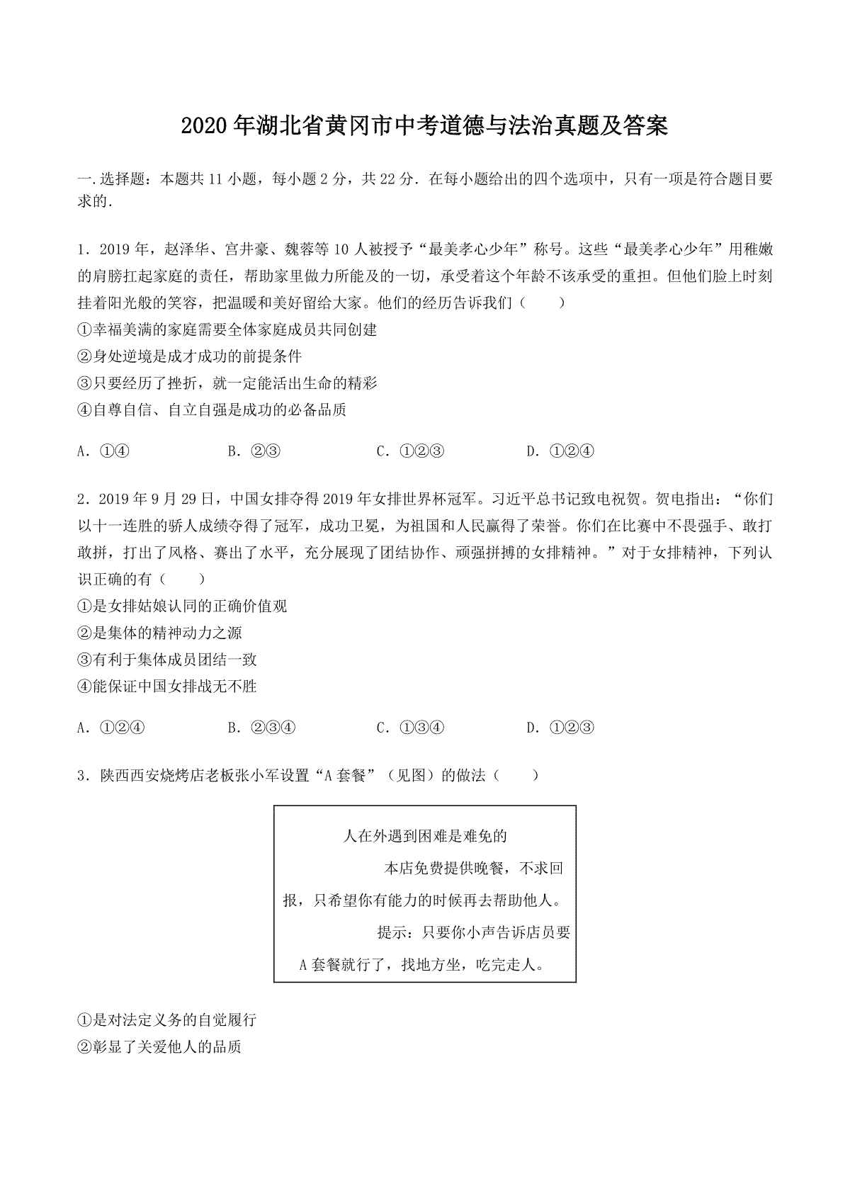 精品解析:湖北省黄冈市2020年中考道德与法治试题(解析版)
