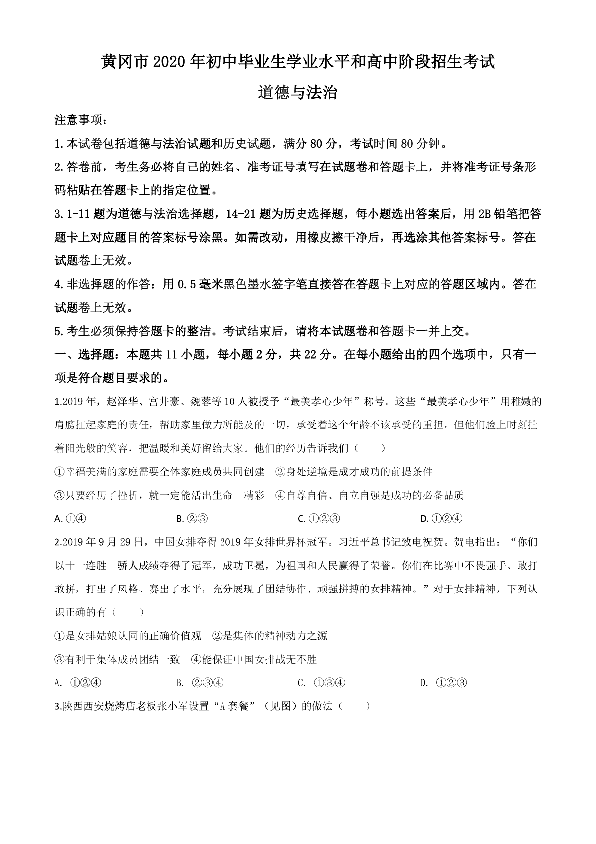 精品解析:湖北省黄冈市2020年中考道德与法治试题(原卷版)