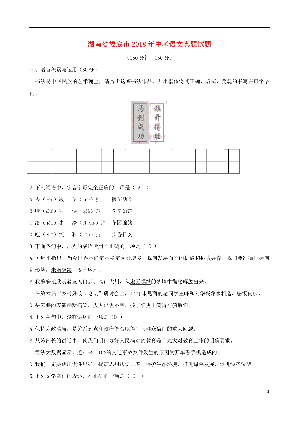 湖南省娄底市2018年中考语文真题试题(含答案)