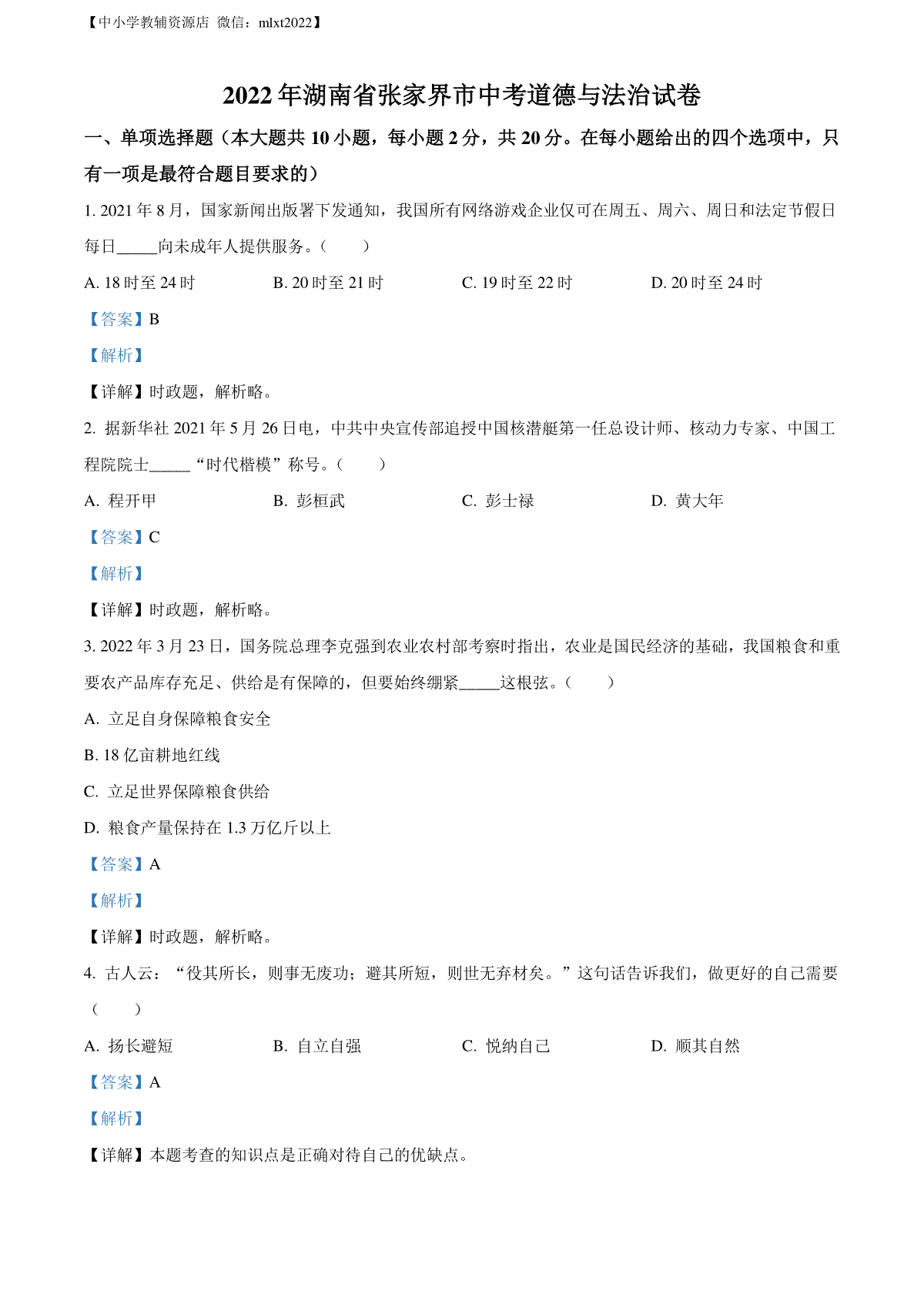 精品解析:2022年湖南省张家界市中考道德与法治真题(解析版)(1)