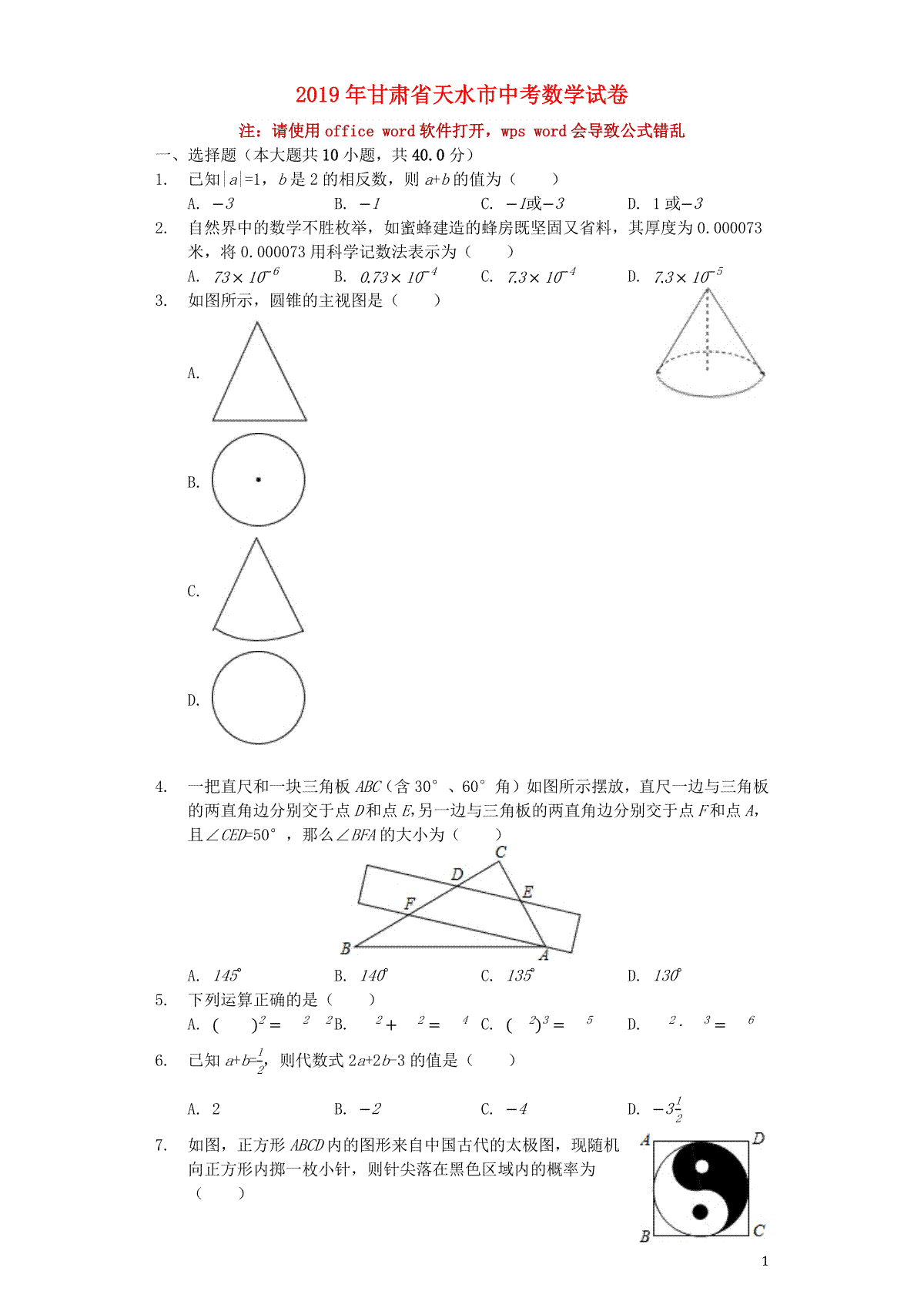 甘肃省天水市2019年中考数学真题试题(含解析)